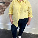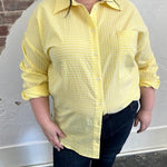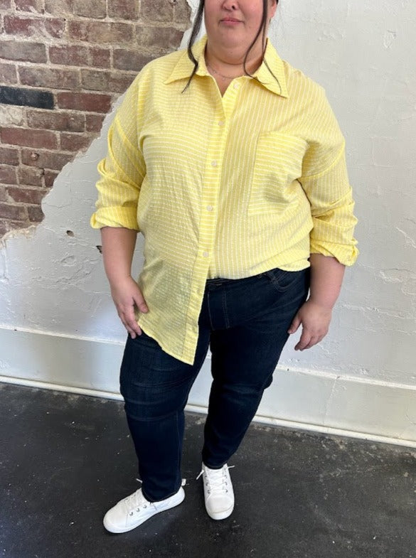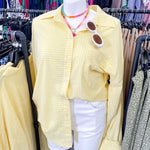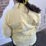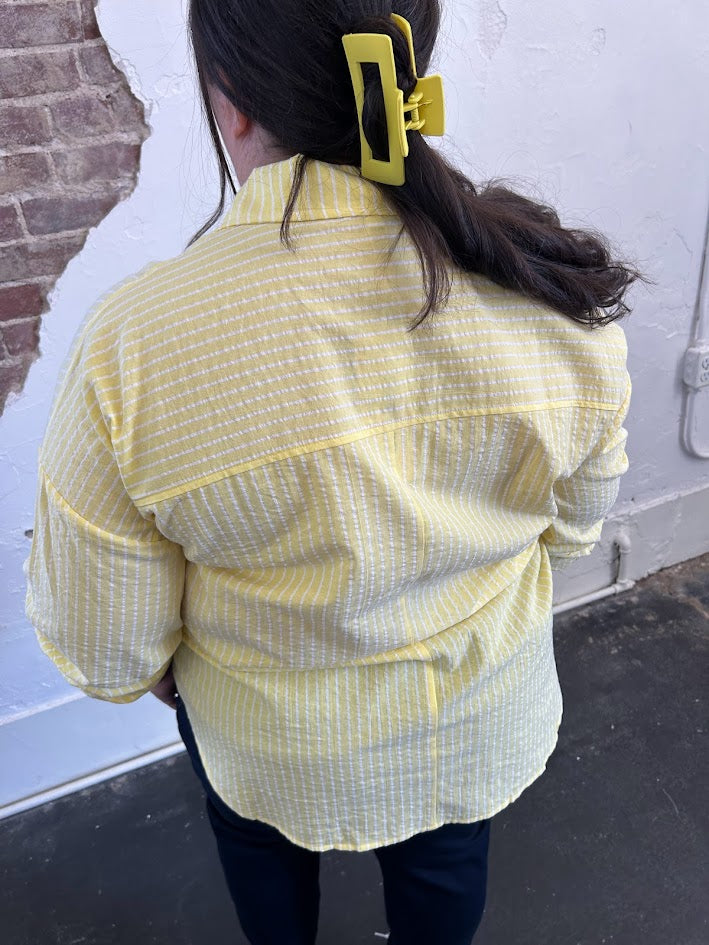 Upgrade your staple wardrobe with our Living Freely top! Sophisticated and timeless, this striped button-down features dropped sleeves and a collared neckline that provide a polished look. The front pocket and back seams add just the right amount of detail to keep it interesting. We love that vibrant yellow color! Wear this shirt with denim and accessorize with your favorite jewelry. Don't miss out on this high-quality top!
