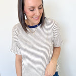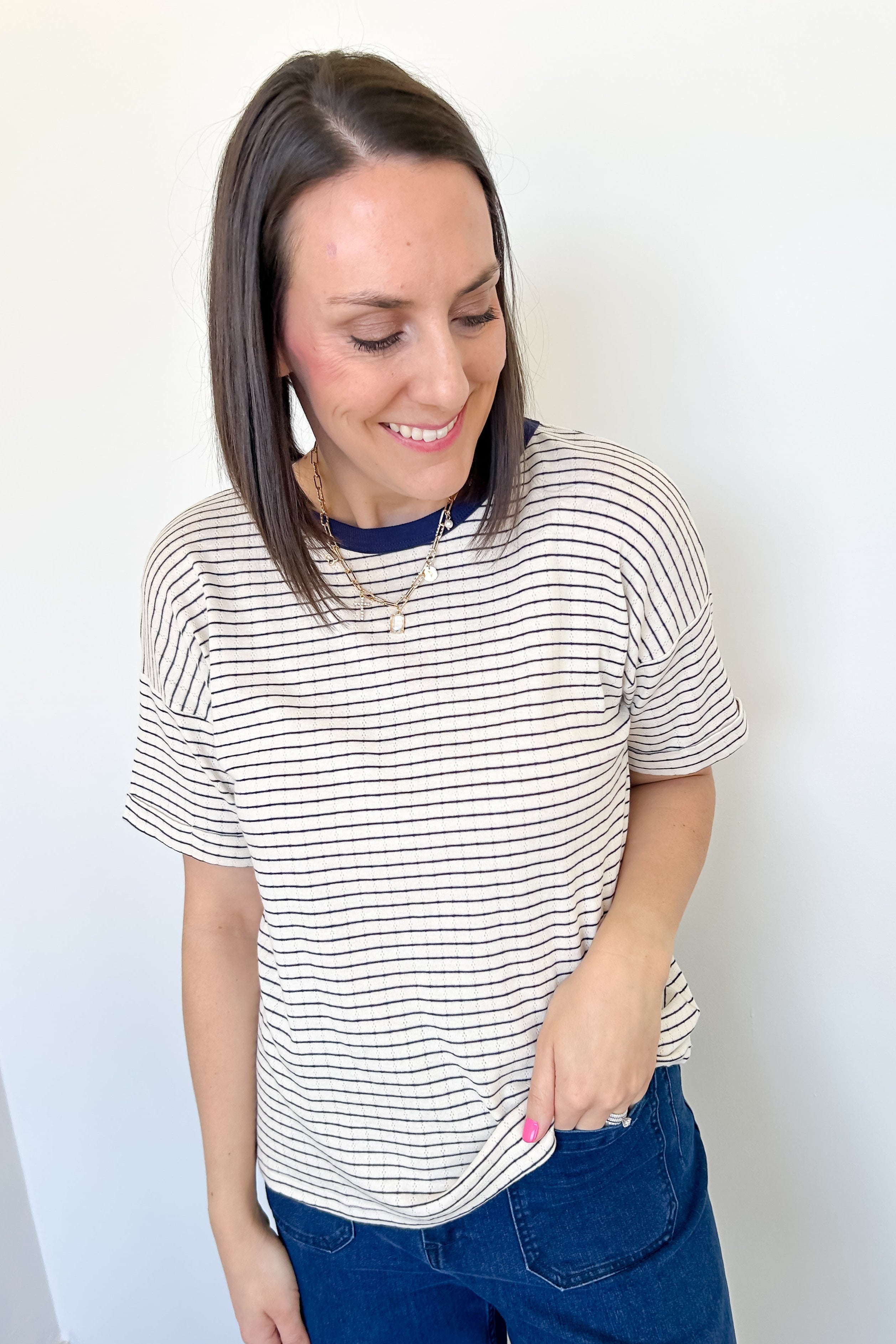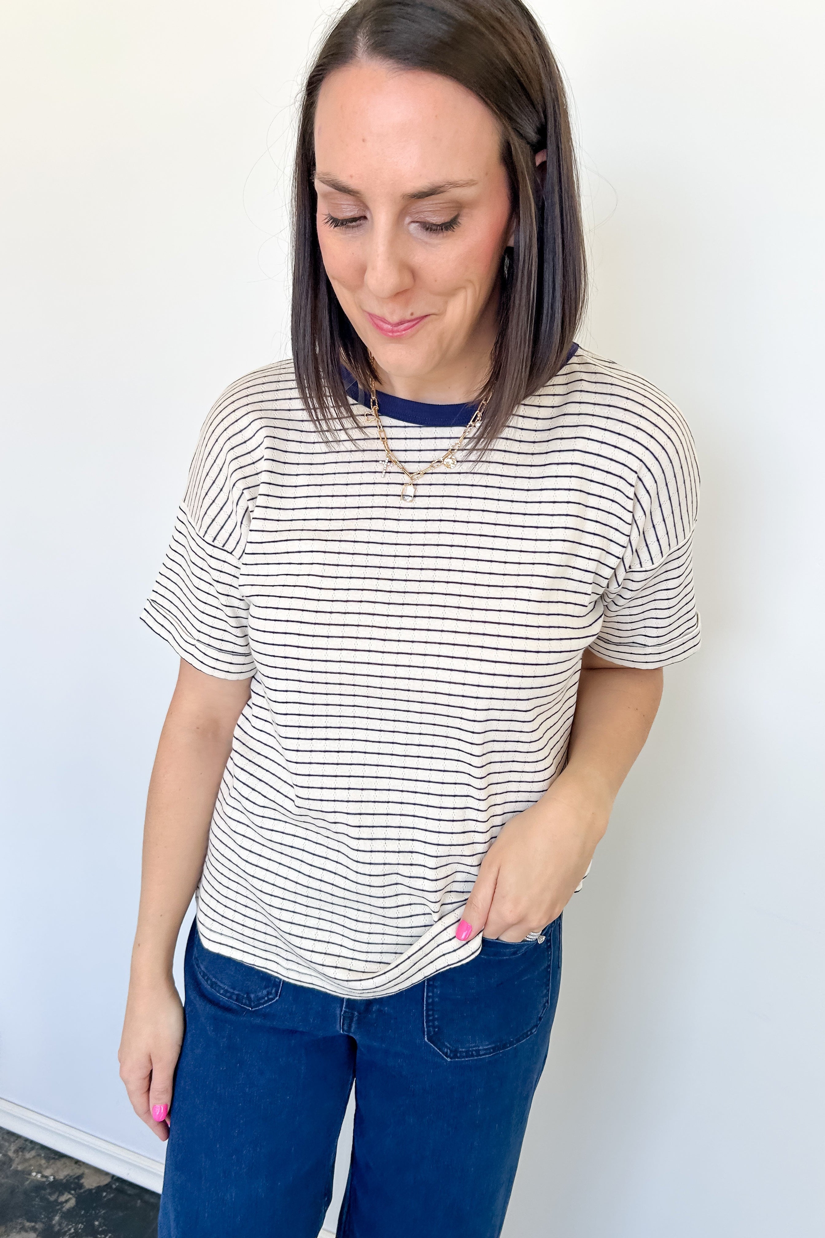 Add some ease to your closet with our Easy Decisions Pointelle Top! The delicate pointelle knit and striped pattern add a touch of style to the classic crew neckline. Short drop sleeves and a relaxed fit make for effortless comfort and versatility. Say yes to this top and elevate your wardrobe!