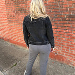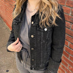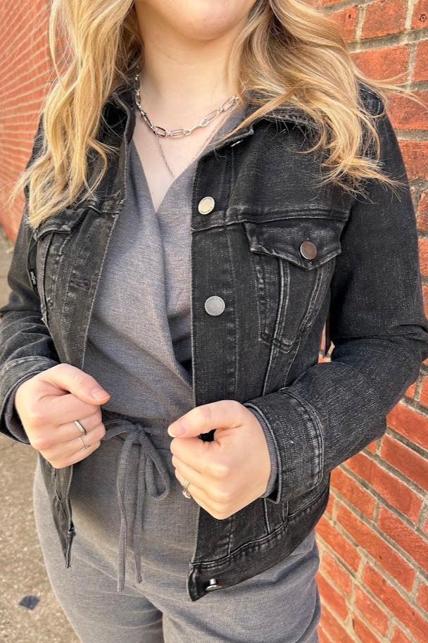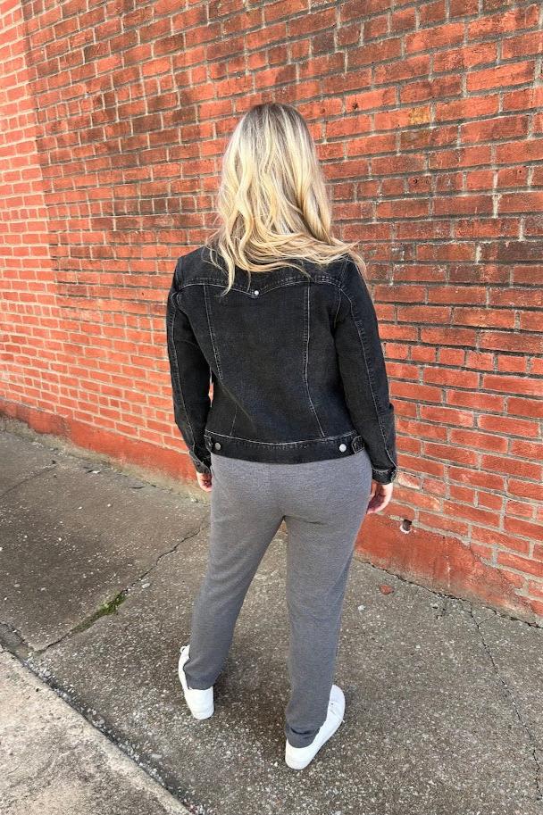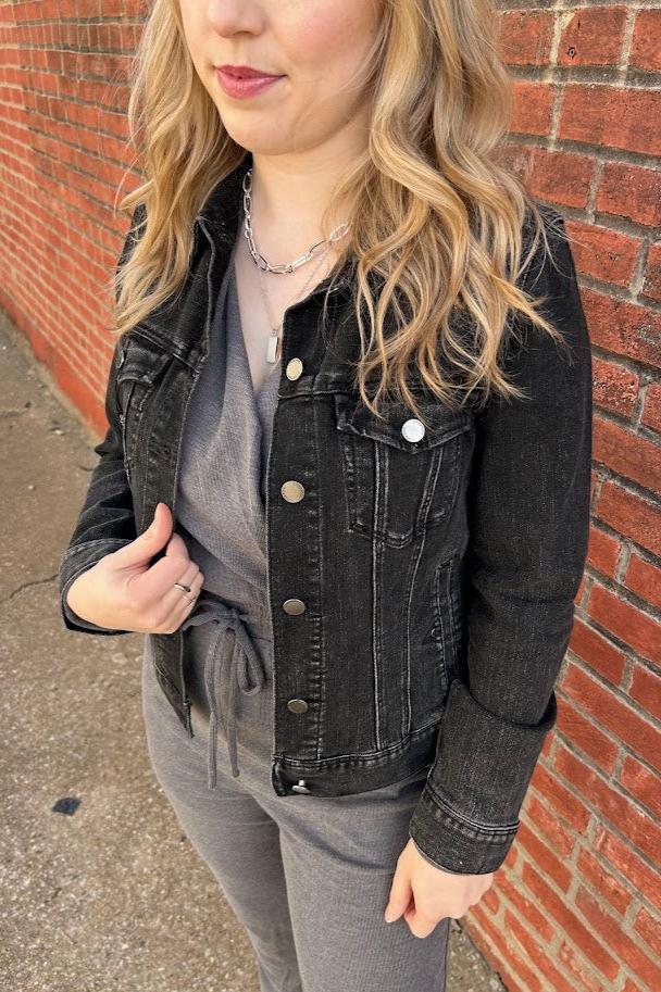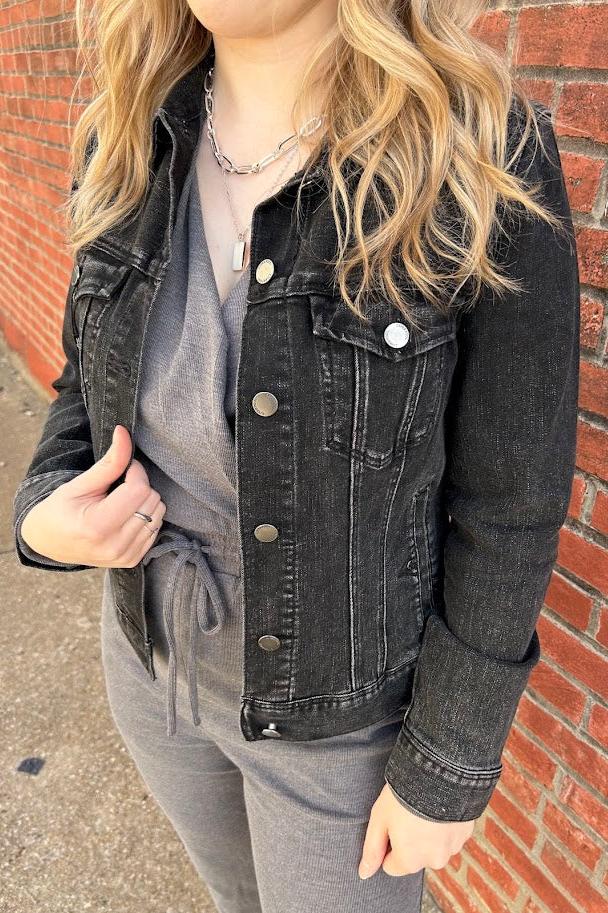 Our Liverpool classic jean jacket with amazing recovery. Your go-to layering item that adds the perfect touch to any outfit is made with comfortable fabric that won't stretch out!
