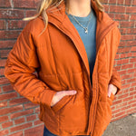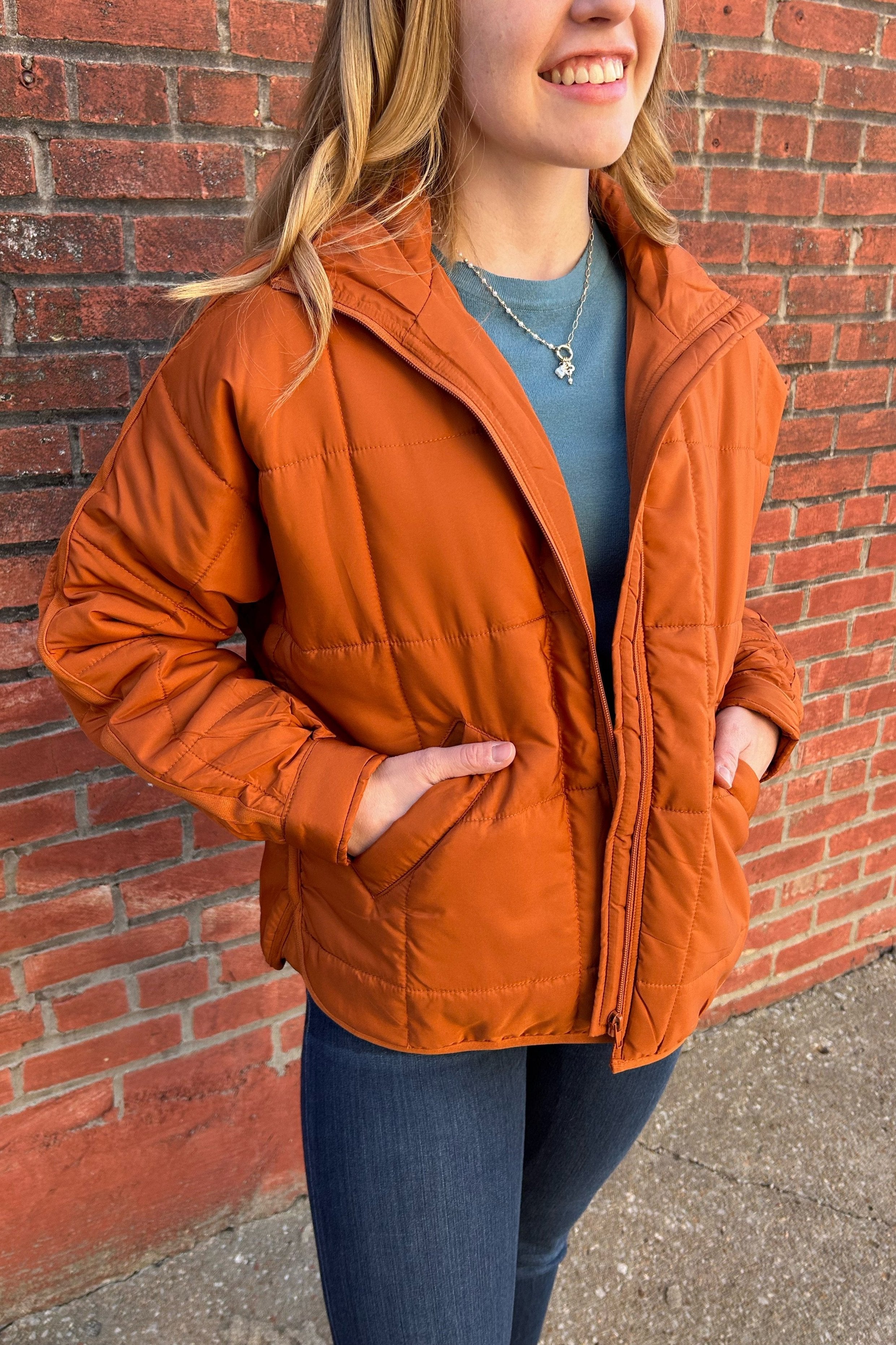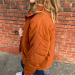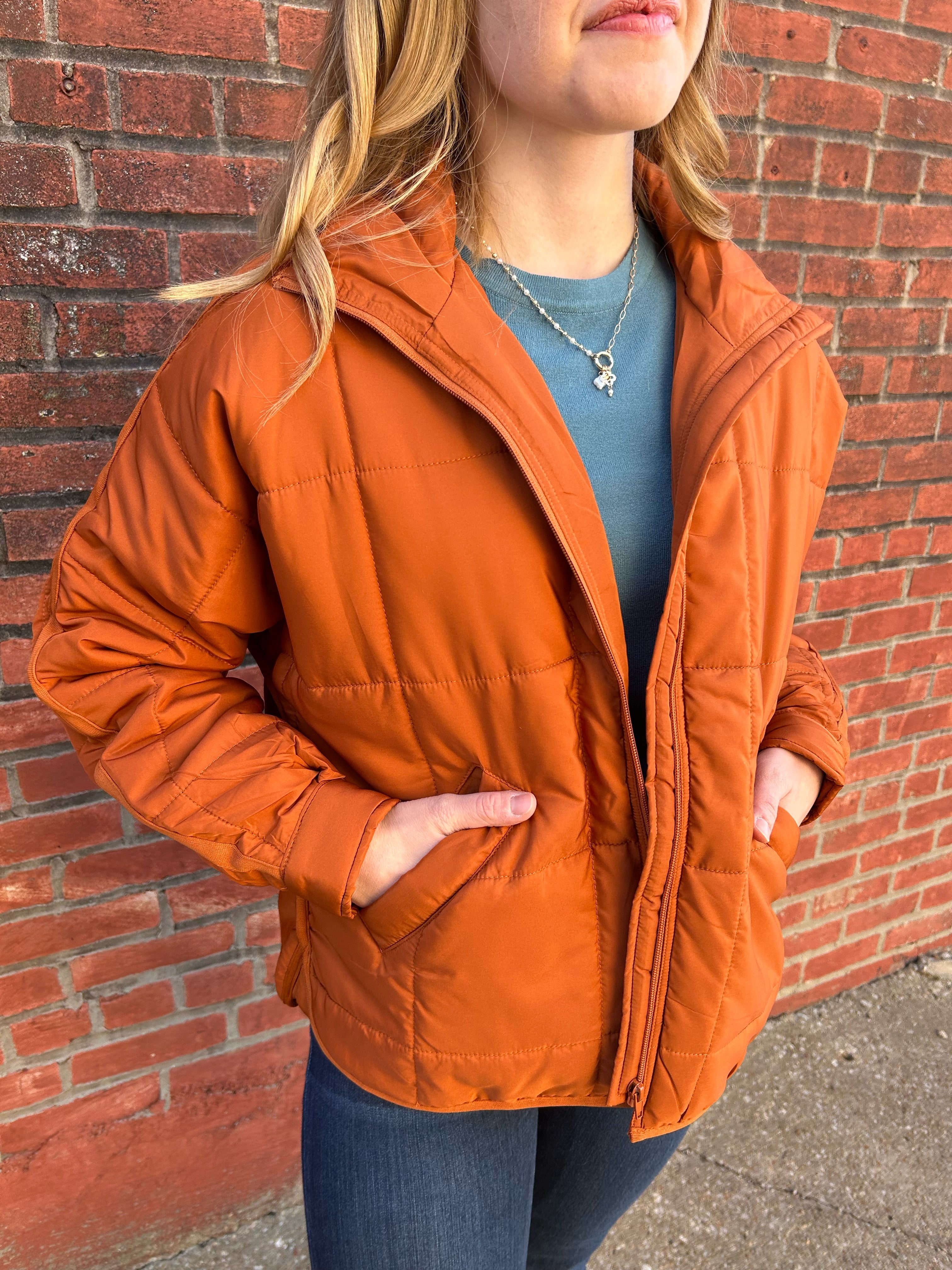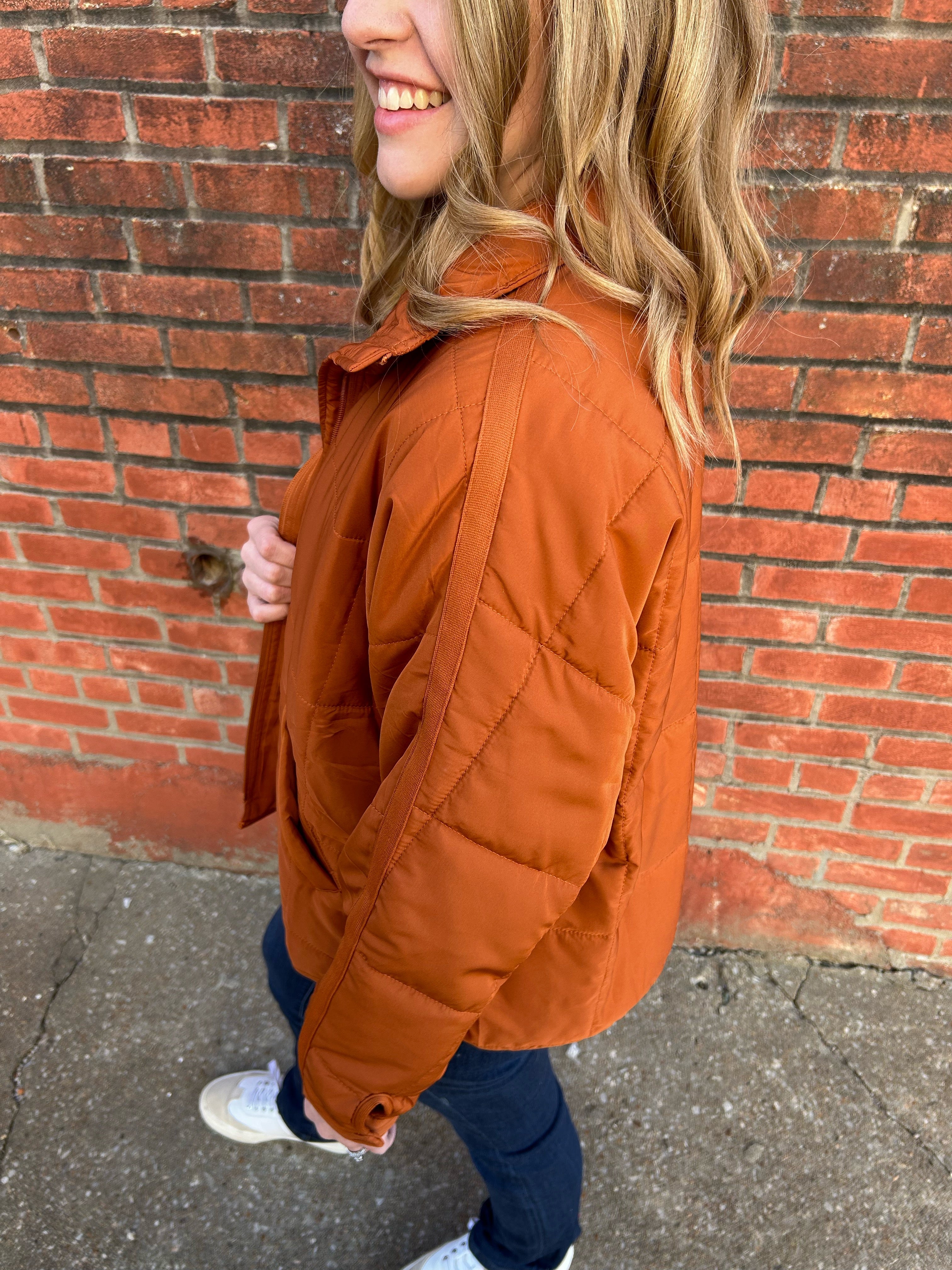 Stay stylish and cozy this Fall with The Jasmine Puffer Coat. In a trendy caramel color, this fashion forward coat features button detailing and a quilted look. Perfect for those chilly days! Add a pop of color to your look by throwing this coat over a work blouse or a simple everyday tee. This coat pairs perfectly with all denim!