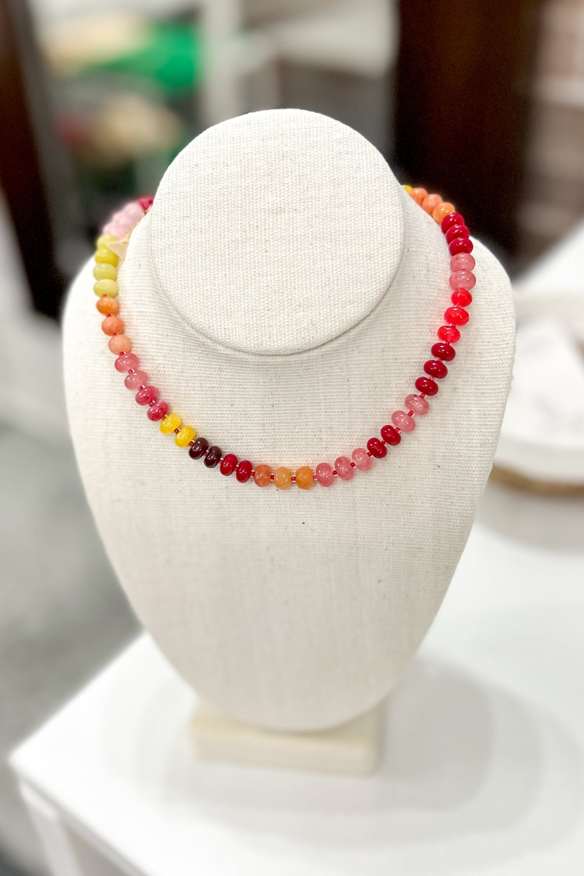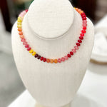 This expertly crafted Rainbow Necklace features a vibrant cherry-colored gemstone, adding a pop of color to any outfit.