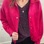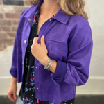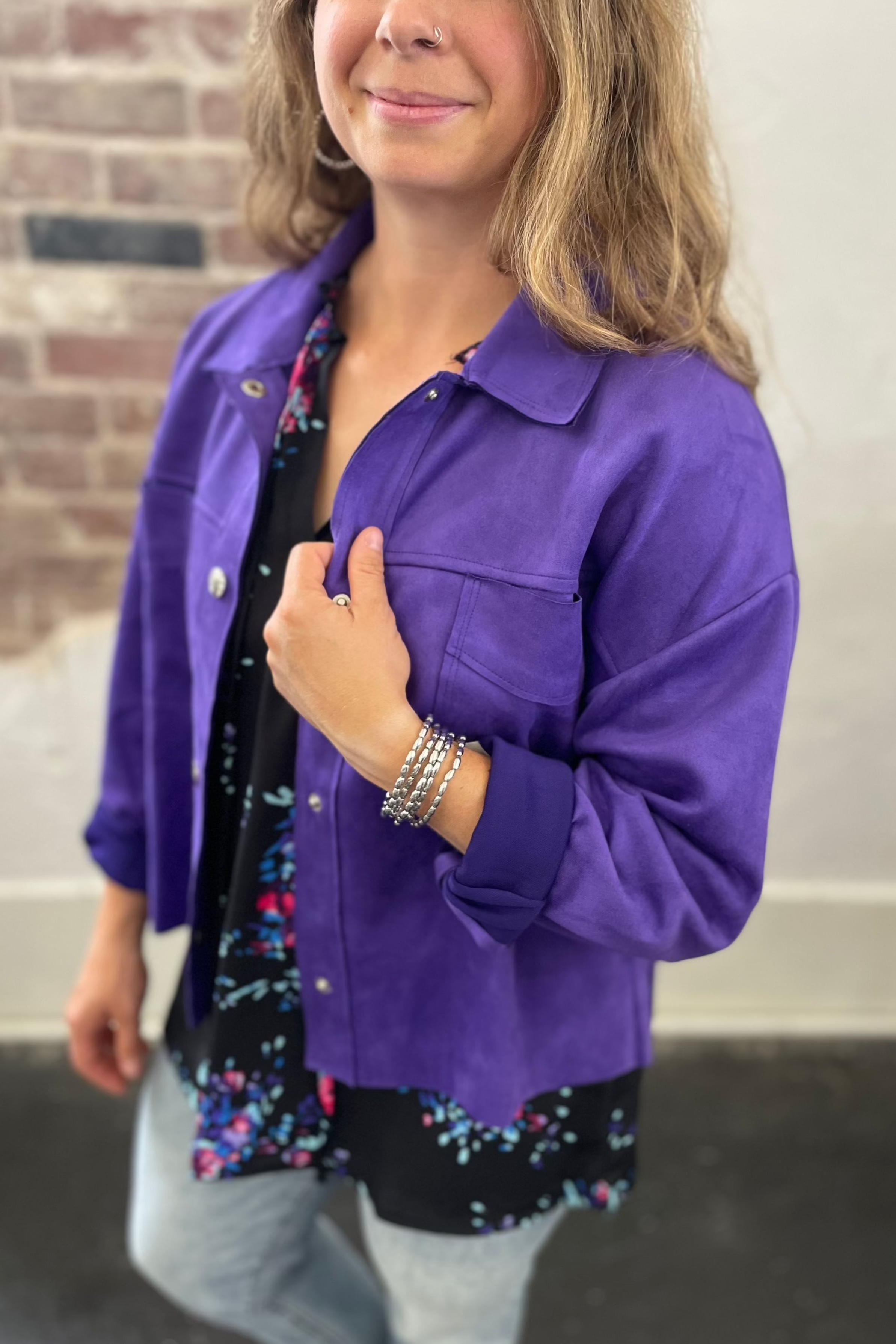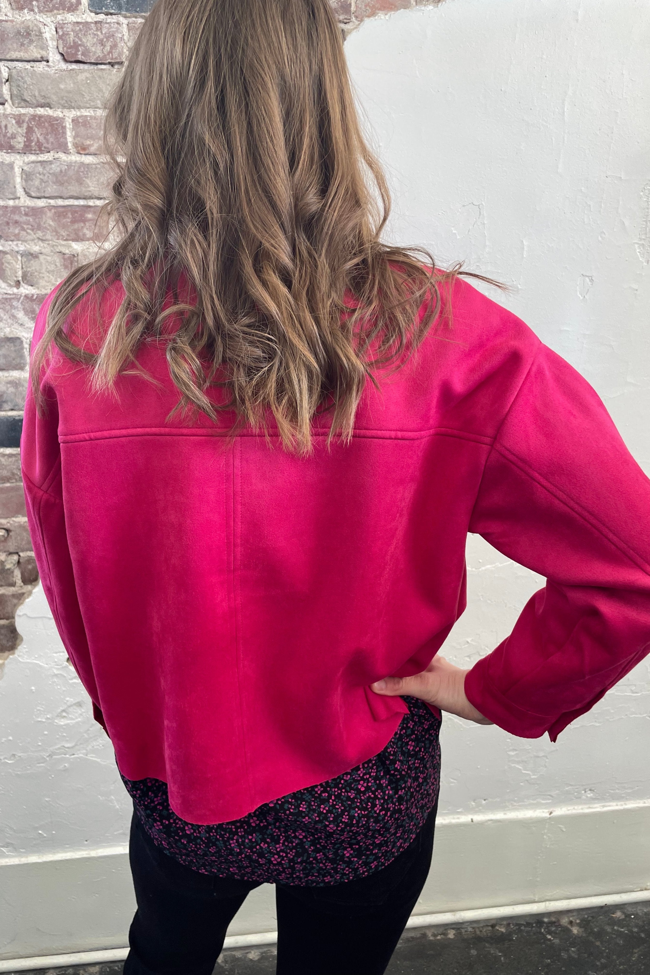 This cropped suede jacket is a dream! The perfect amount of stretch and in two amazing colors. The hemline hits right around the top of the hip which is a very flattering fit for most.