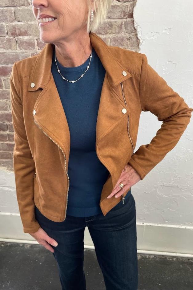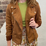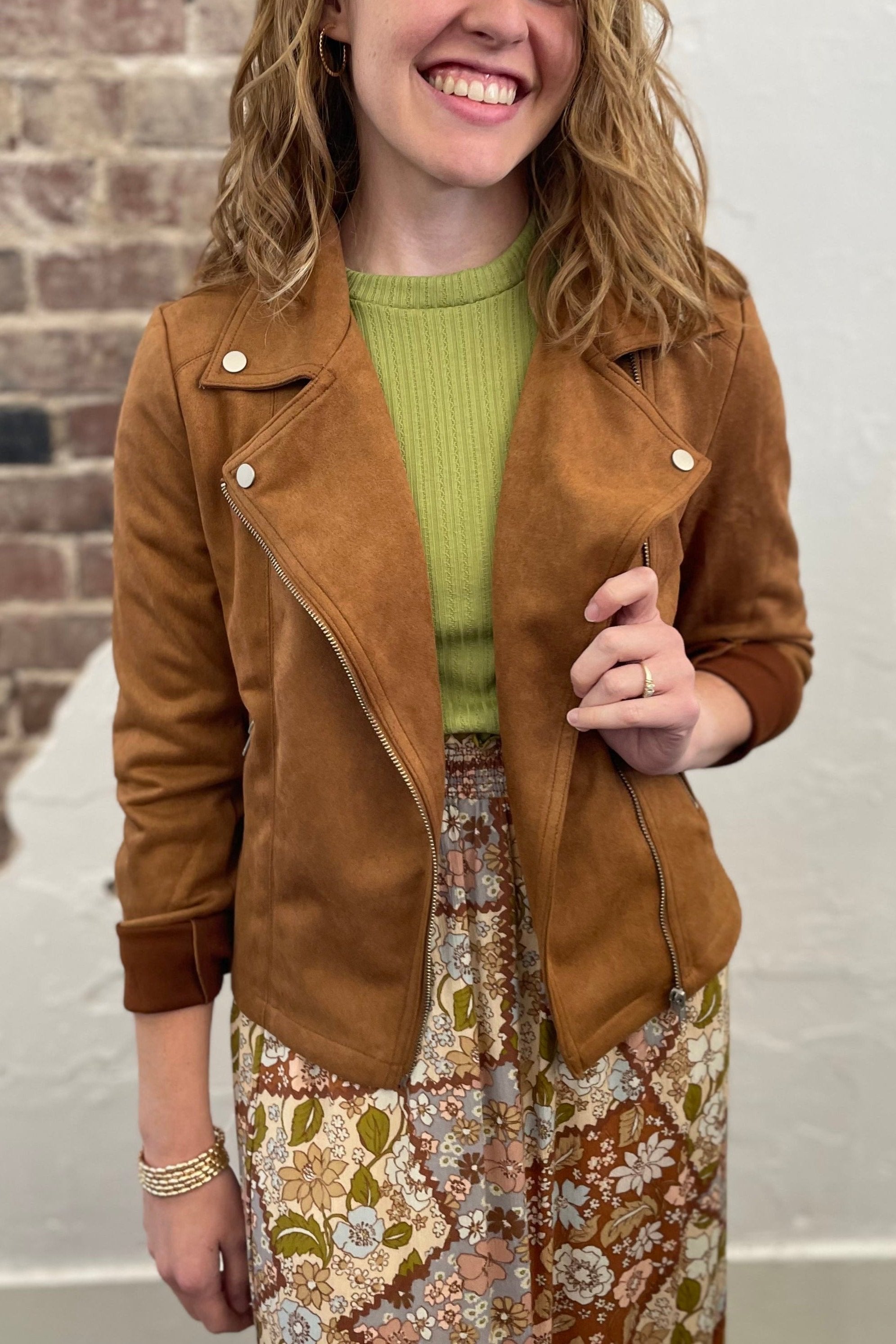 Get ready to show off your sleek style in our Suede Moto Jacket! Featuring a fun, stylish collar and decorative buttons, this jacket is sure to make a statement wherever you go! Its perfect fit and soft texture will have you feeling like your best self all day long. Pair with a skirt, dress, or jumpsuit for an outfit that can rock so many different occasions.