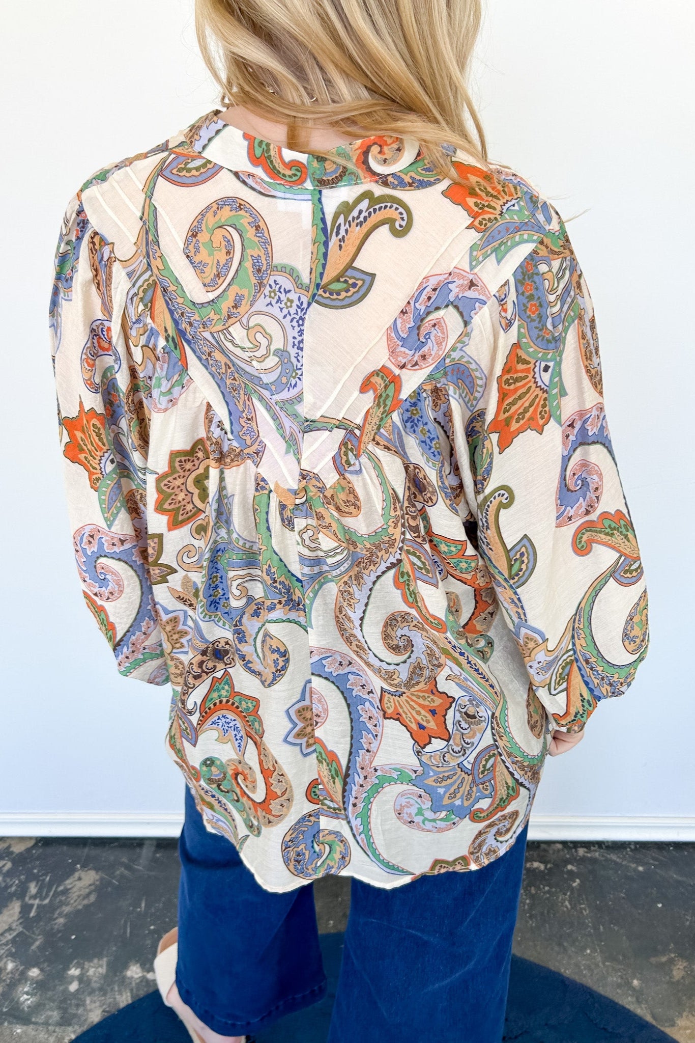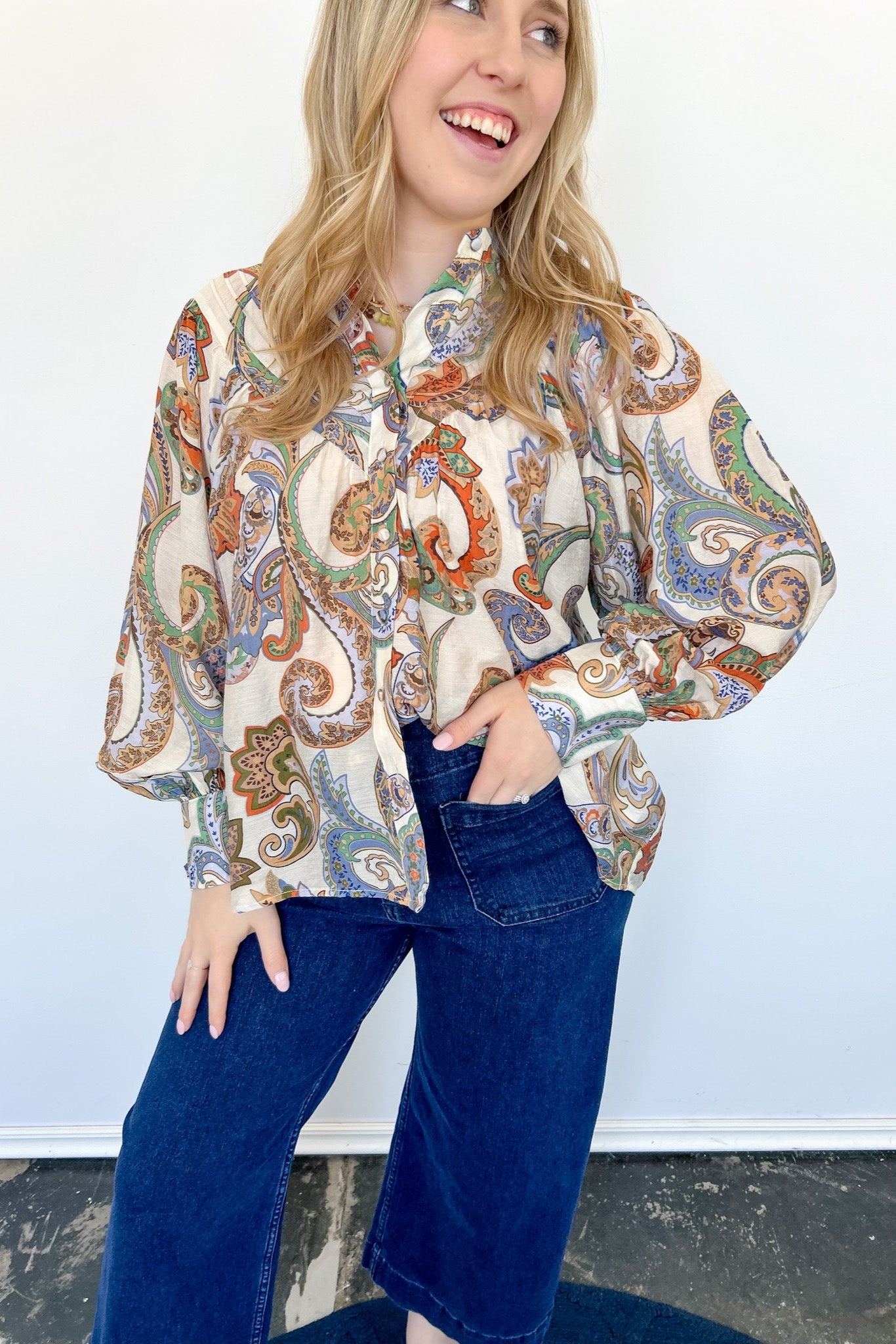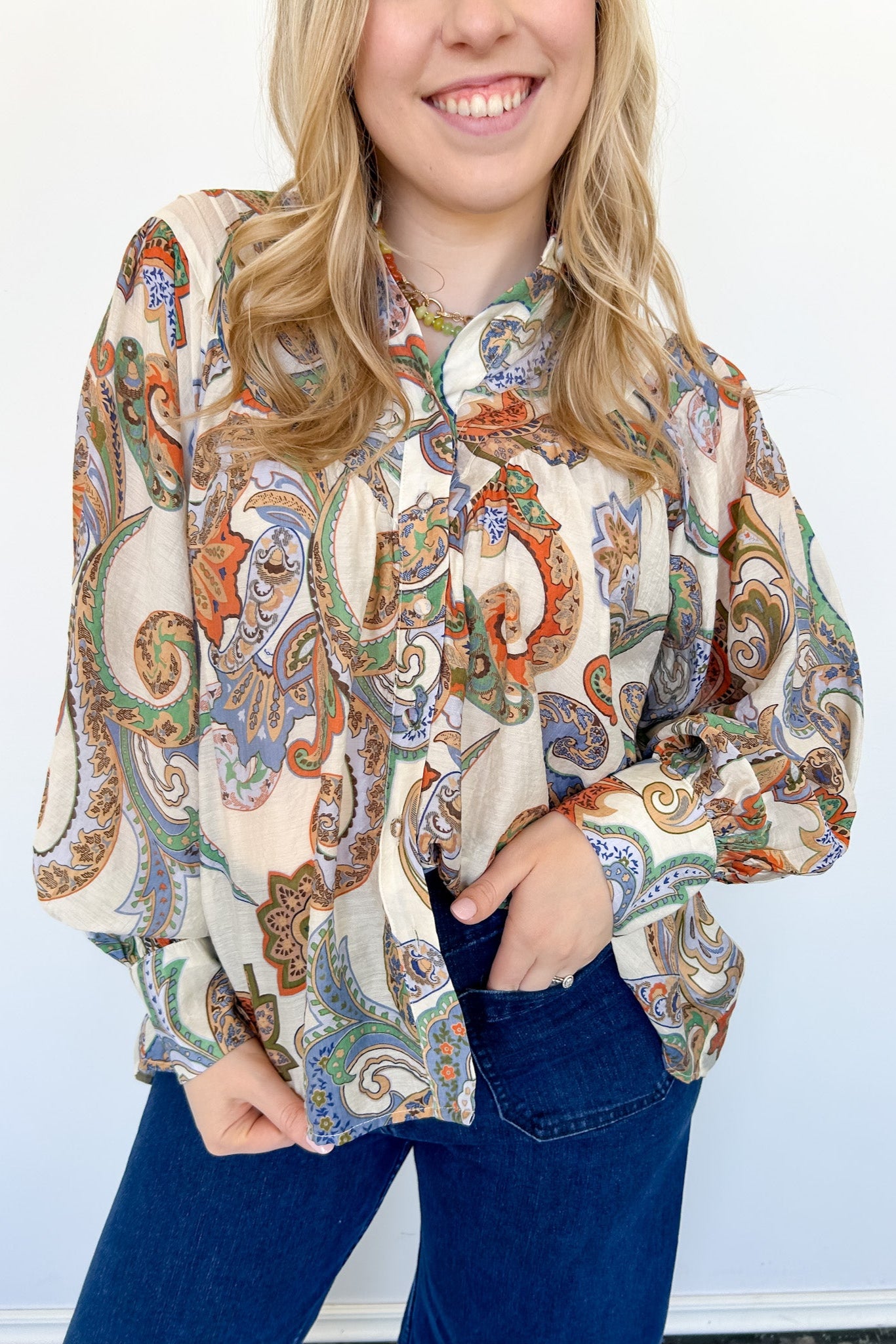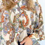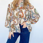 This Far From Me Paisley Print Top is the perfect addition to your wardrobe. With its vibrant multi-colored paisley print, this blouse style top is both fun and flirty. Let your style shine with this must-have piece!