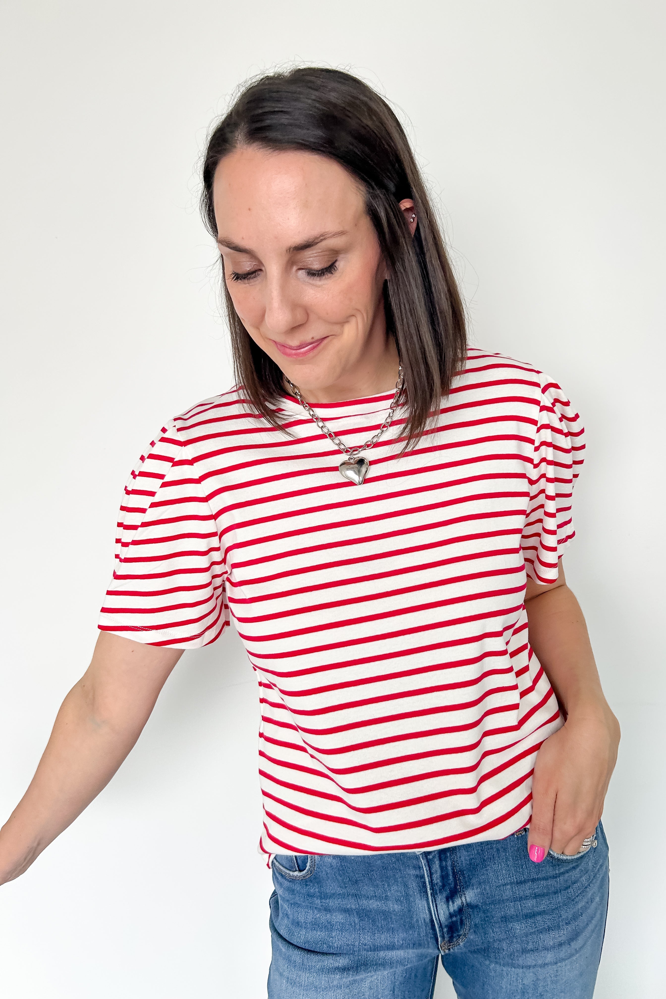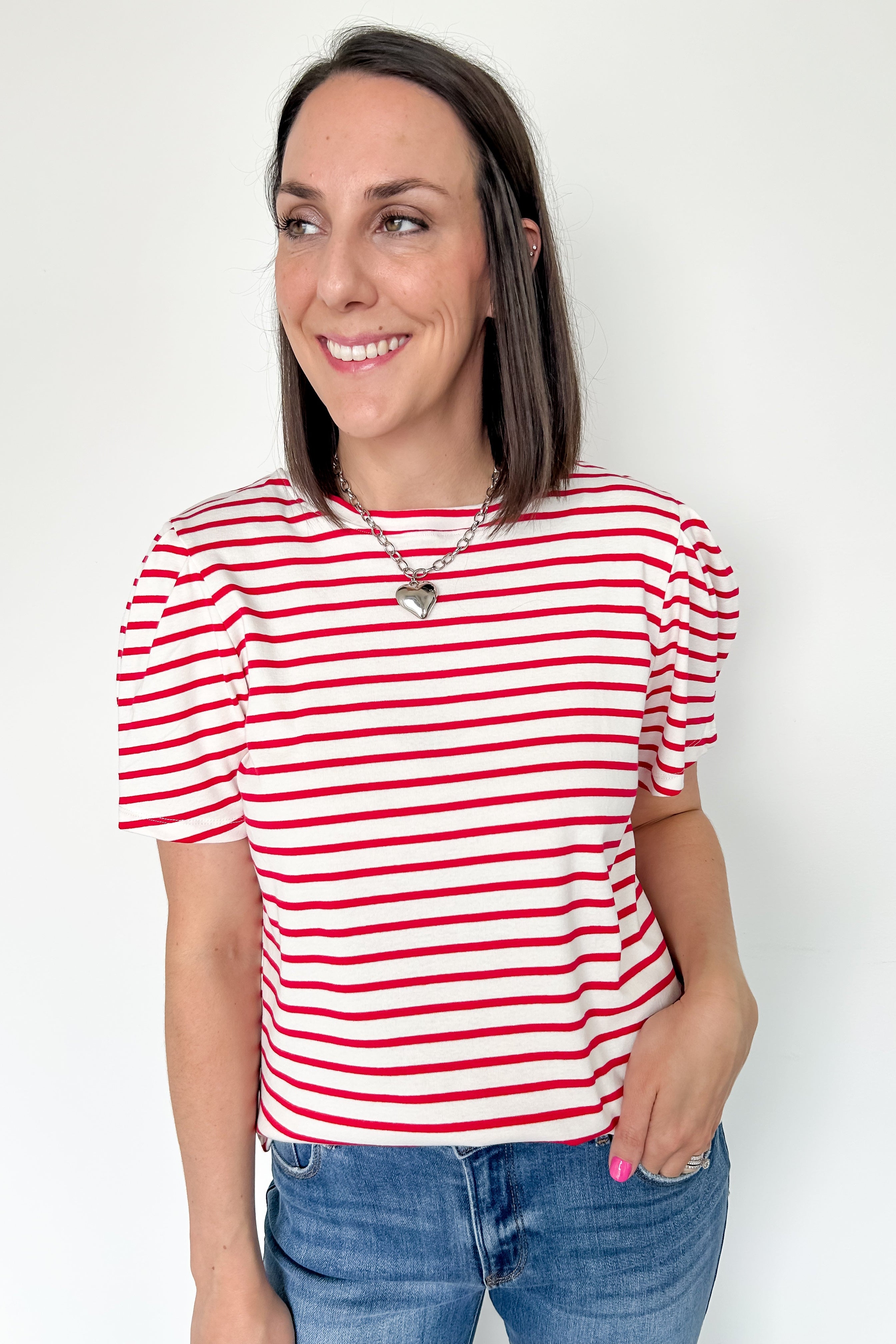 Elevate your style with our Ruby Puff Sleeve Striped Top. The classic red and white stripes add a bold touch to the regular fit design, while the puff sleeves offer a playful twist. Versatile and chic, it's the perfect piece for dressing up or down.