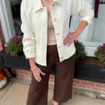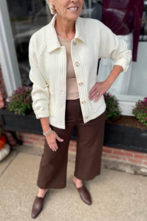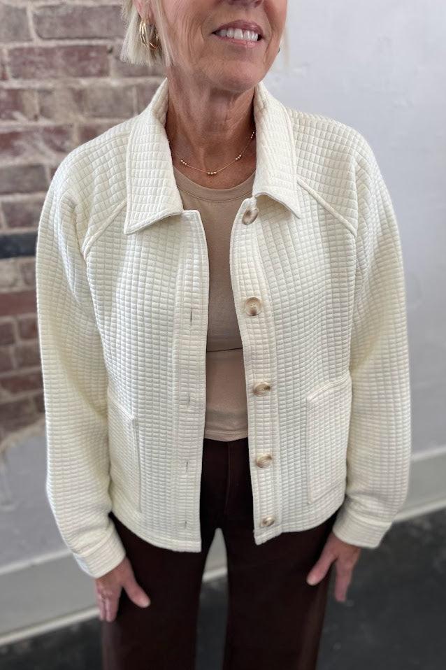 Showcase your amazing style with our Out On The Town Jacket! This button-down jacket is refined and modern. We love the bold collar and unique quilted fabric! Pair with our Soft Washed Wide Leg Pants and a neutral-colored top for a sophisticated outfit that is ready for the office, or your date night afterwards.