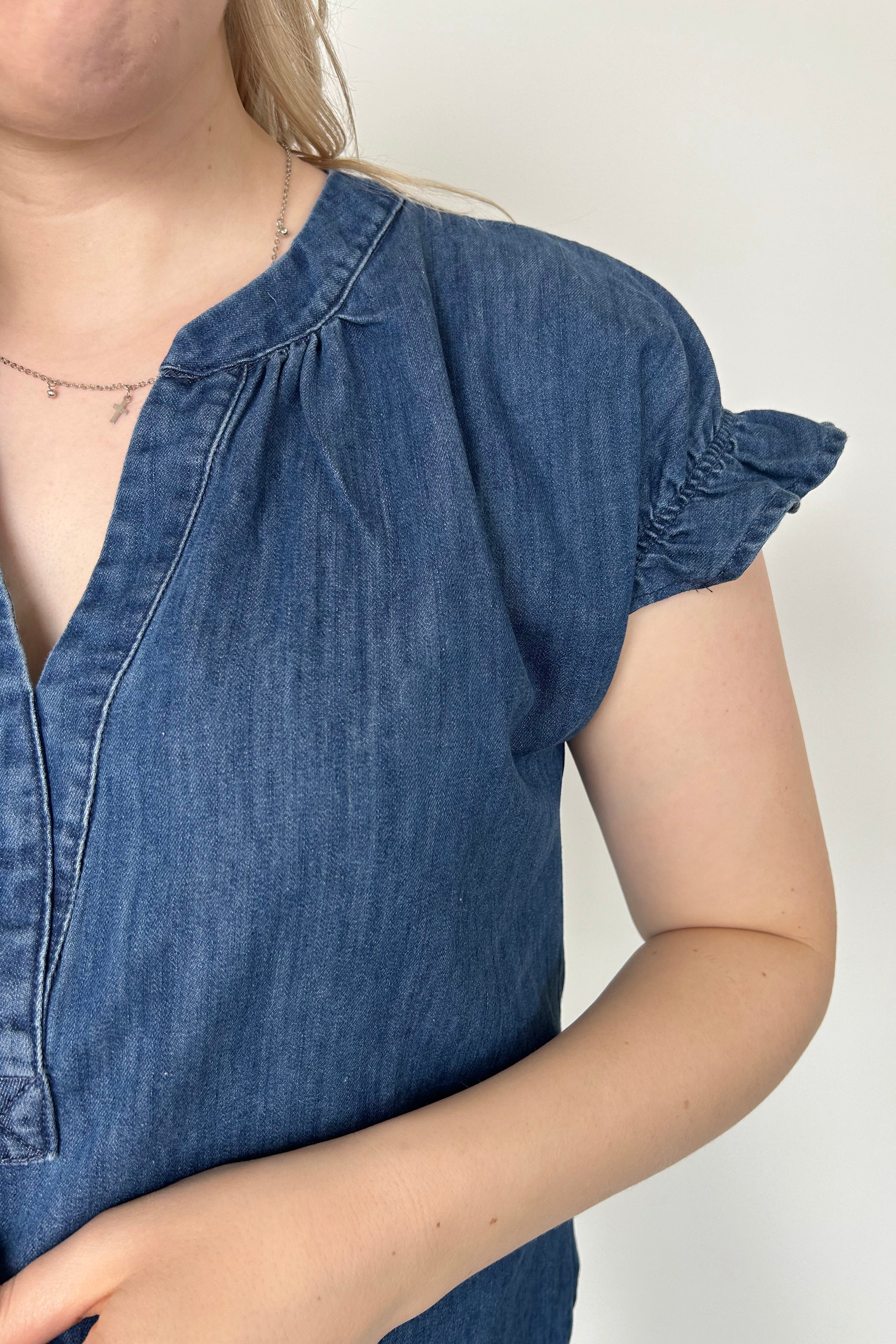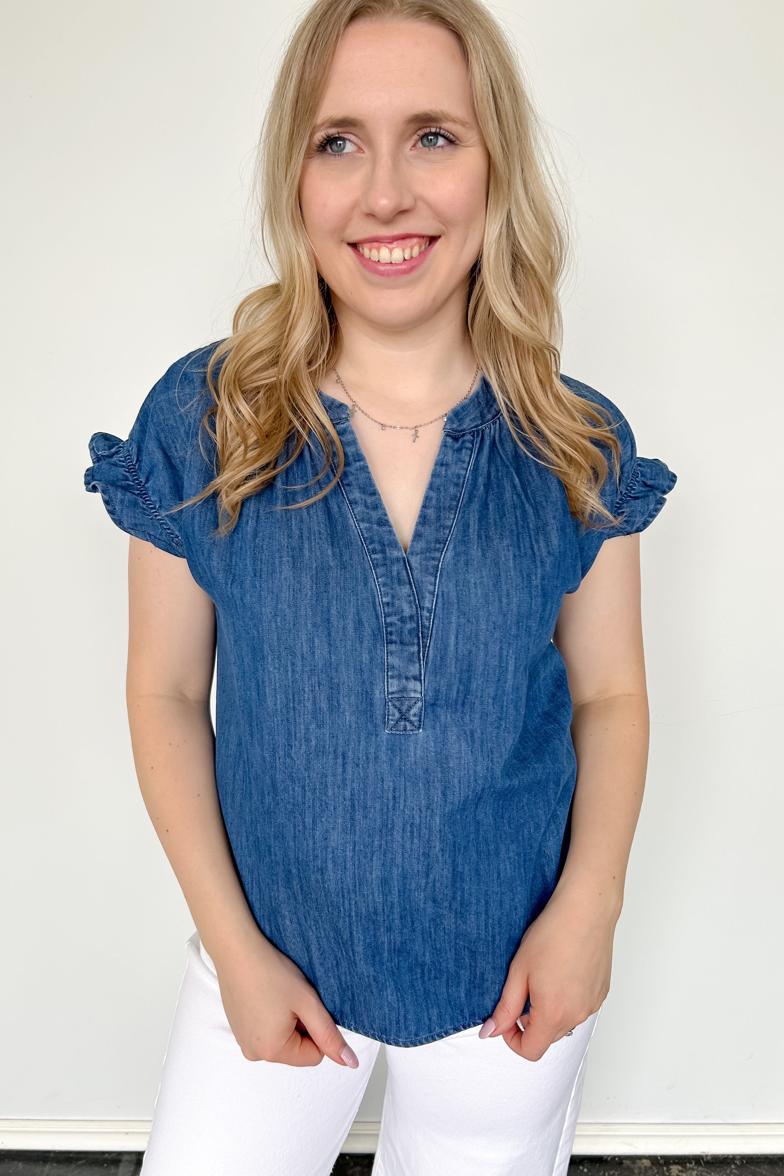 Expertly crafted and designed for versatility, the Della Denim Short Sleeve Top is a must-have addition to any wardrobe. The V neckline accentuates your neckline while the medium denim color adds a touch of casual sophistication. The short ruffled sleeves and regular fit provide comfort and style, perfect for pairing with white denim for a timeless look.
