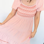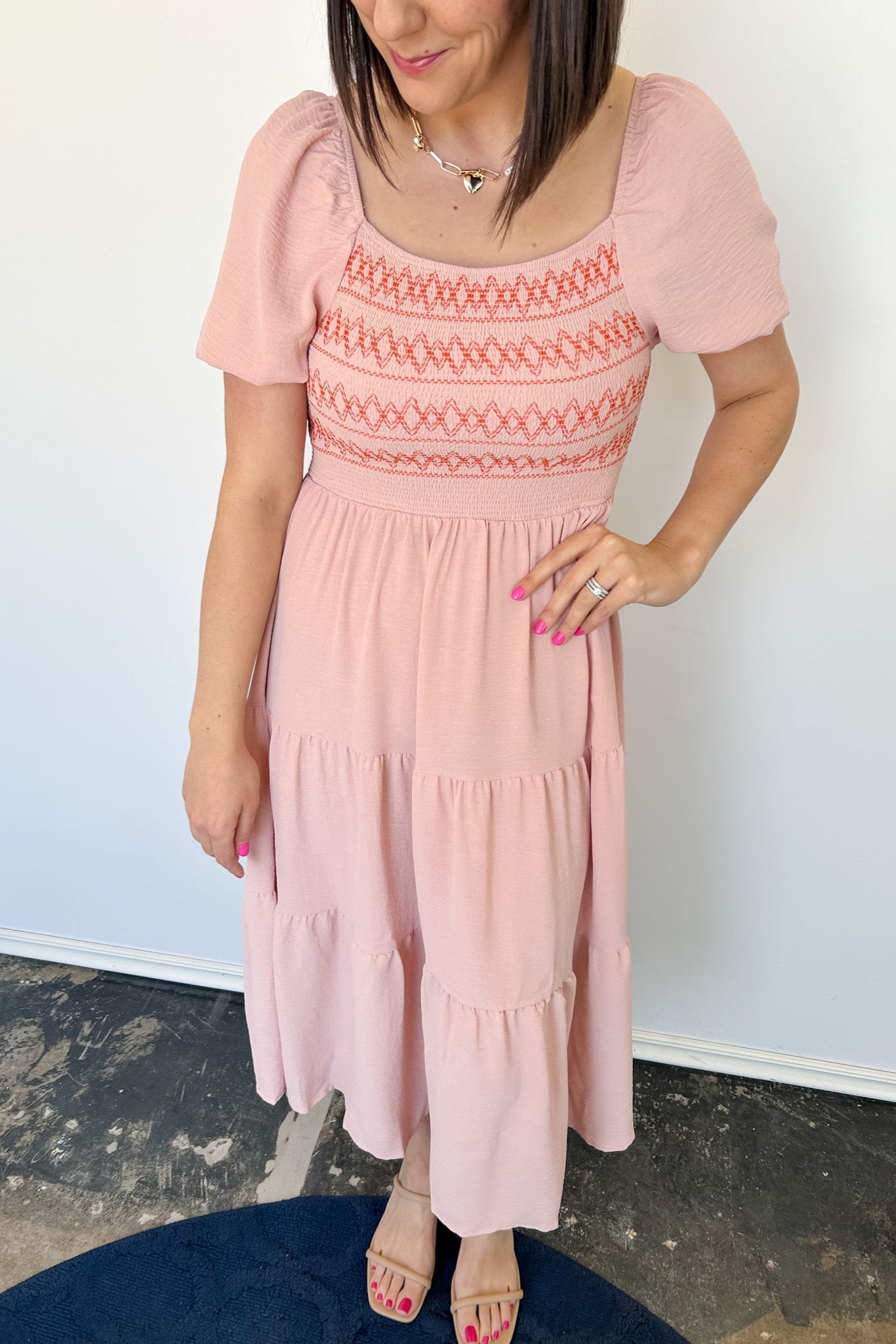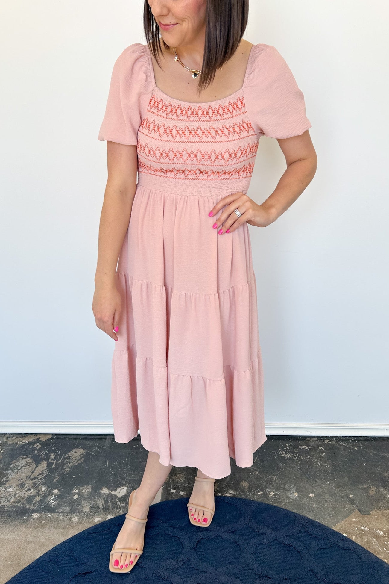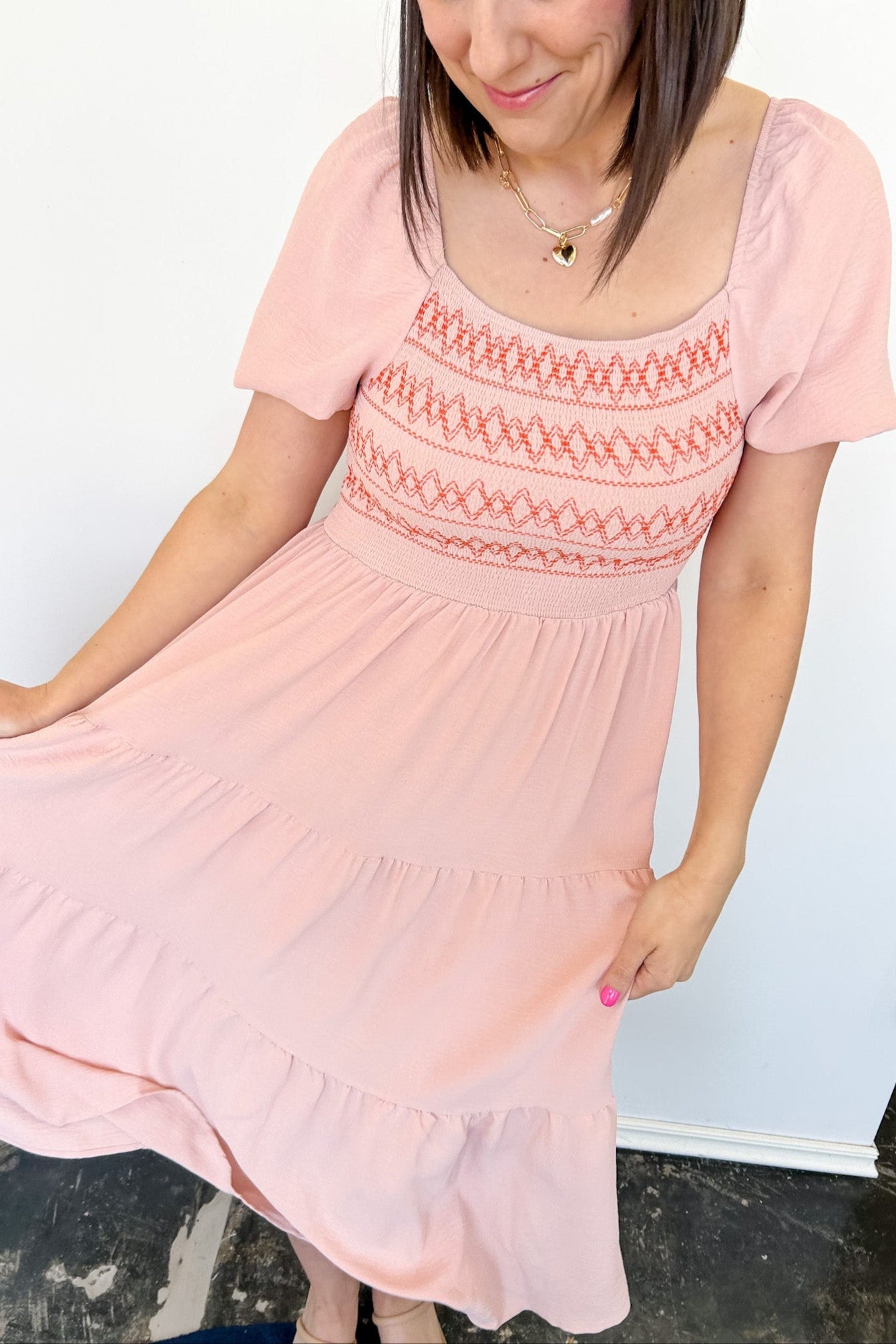 Get ready to enjoy every moment in this fun midi dress! With a square neckline and short puff sleeves, this dress provides a romantic and timeless look. The smocked bust adds a flattering touch that is completed by the tiered, flowy skirt. Perfect for twirling and dancing to your heart's content! Style with sandals or sneakers for an easy outfit that radiates happiness.