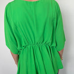 photo of model wearing a bright green, kimono sleeve top with v-neck