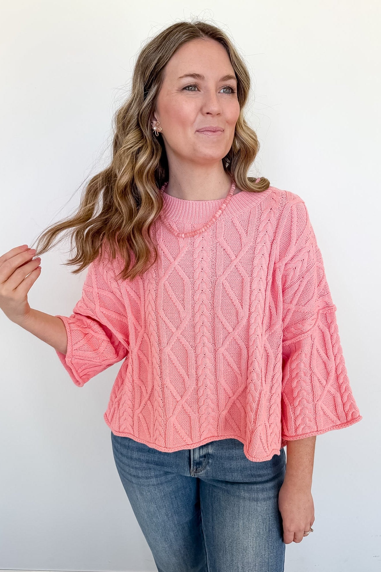 Elevate your casual wardrobe with this refined cable knit top, featuring an eye-catching upside-down pattern that adds visual intrigue. The chunky knit construction delivers texture and dimension, while the oversized silhouette provides effortless comfort. A cropped length balances the relaxed fit, and dolman sleeves create an elegant drape. Despite its substantial knit, this piece remains lightweight for year-round versatility. The classic round neckline keeps the look timeless. Choose from two sophisticated colorways to match your personal aesthetic.