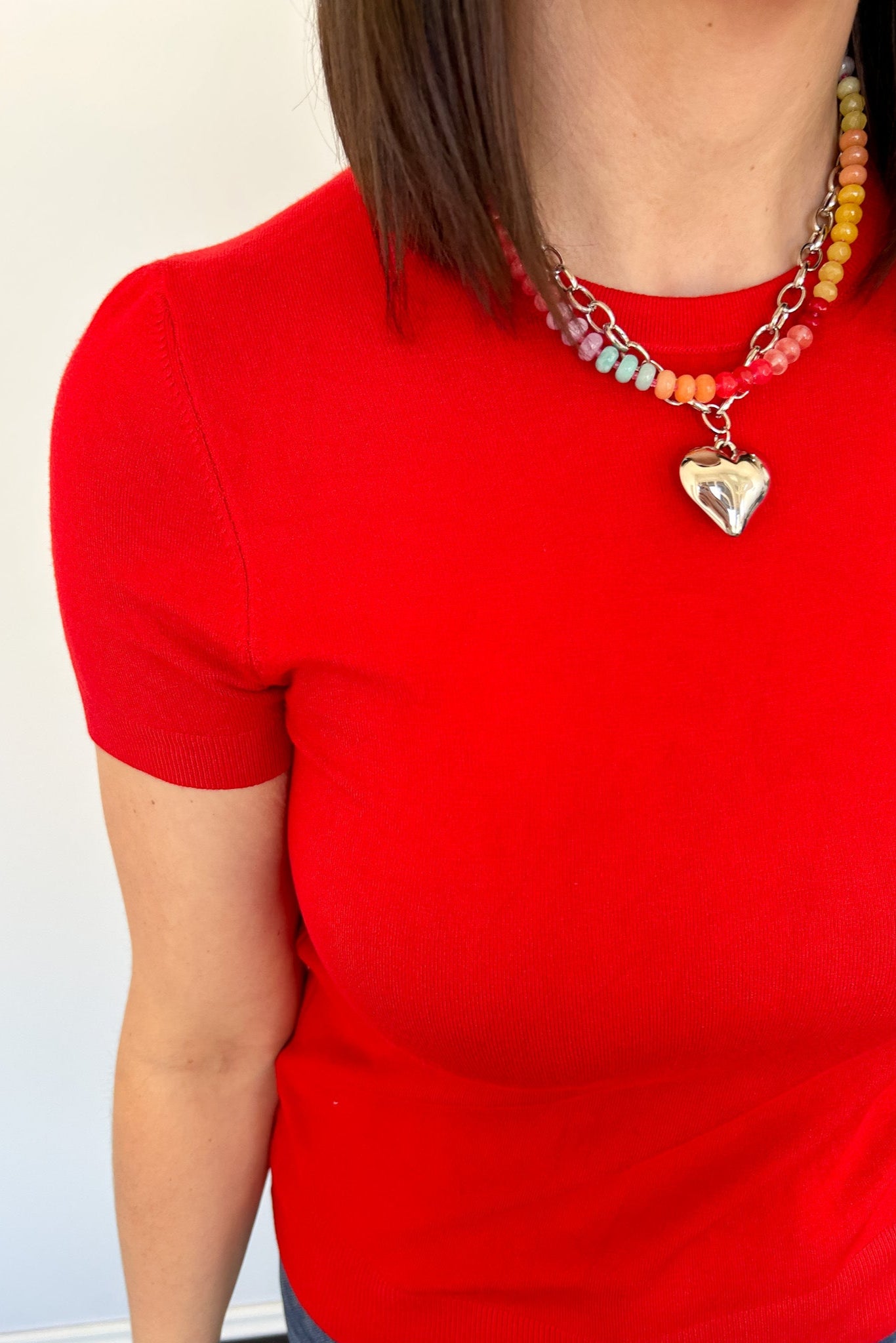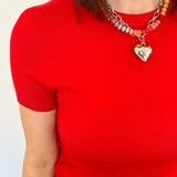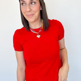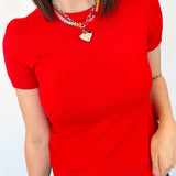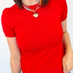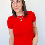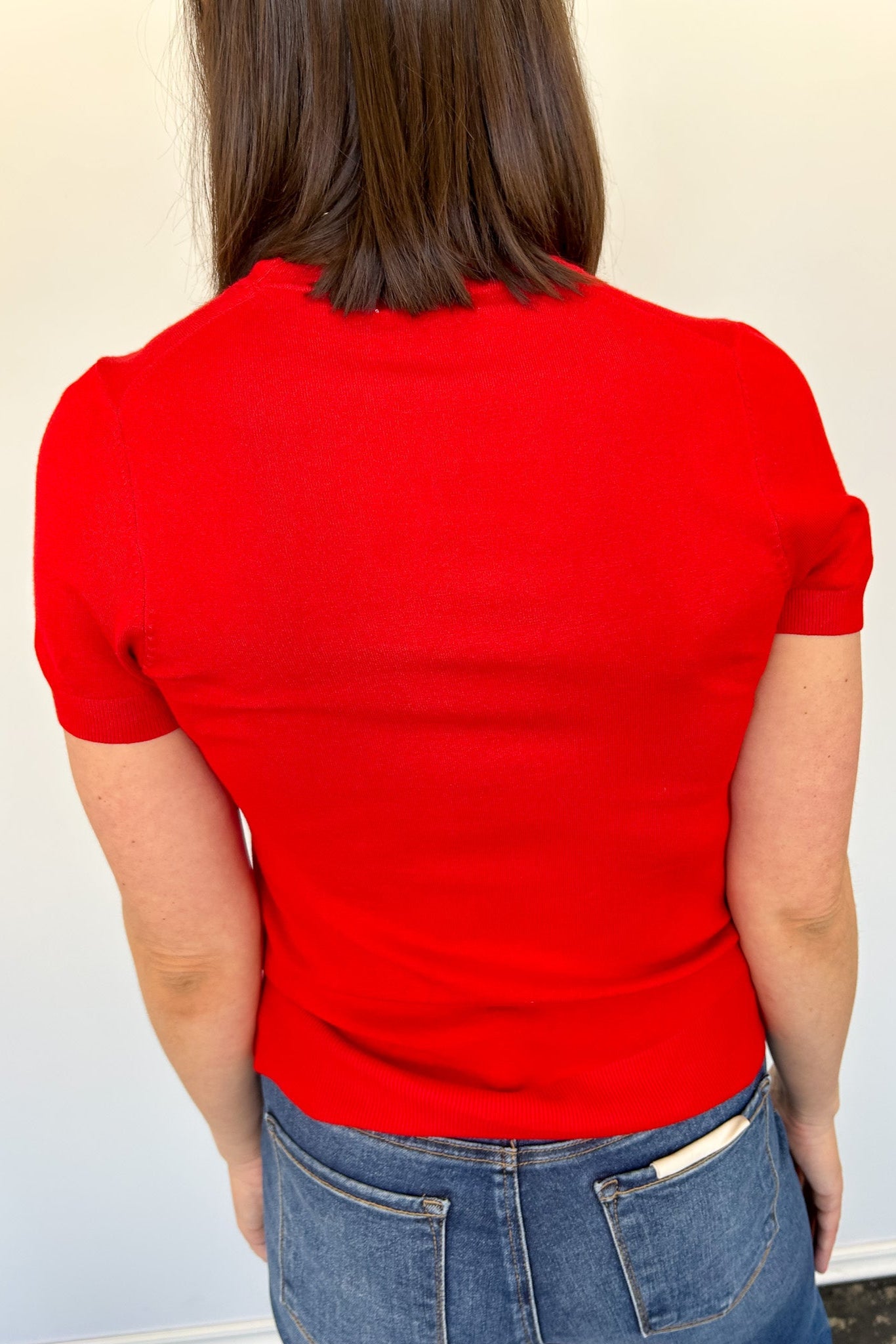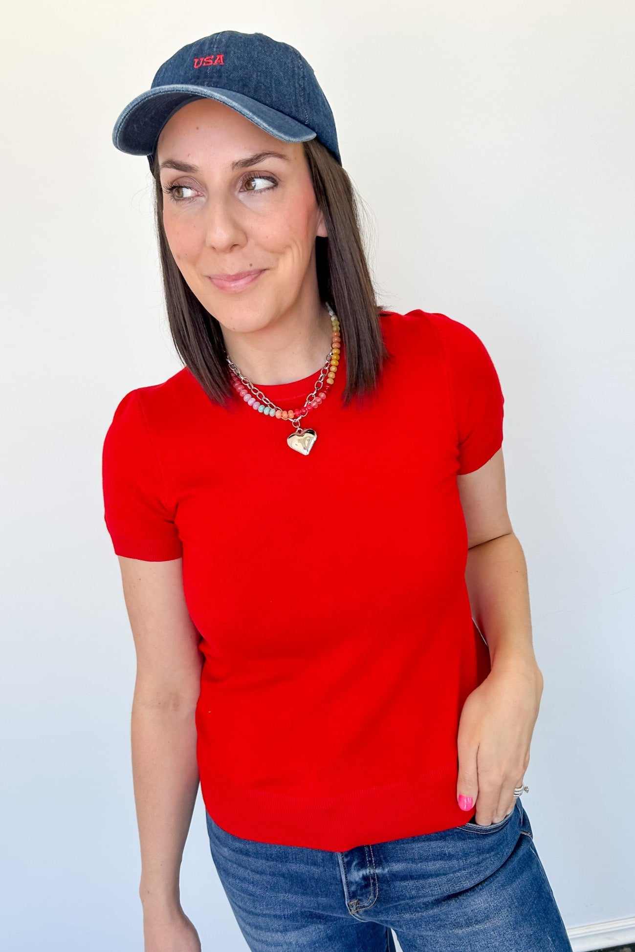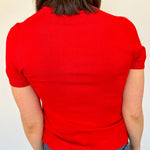Spice up your wardrobe with our Firecracker Short Sleeve Sweater. In striking scarlet, this round neckline sweater is a must-have basic that will add a pop of color to any outfit. Made from lightweight sweater material, it's the perfect blend of style and comfort.