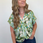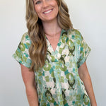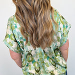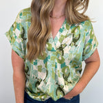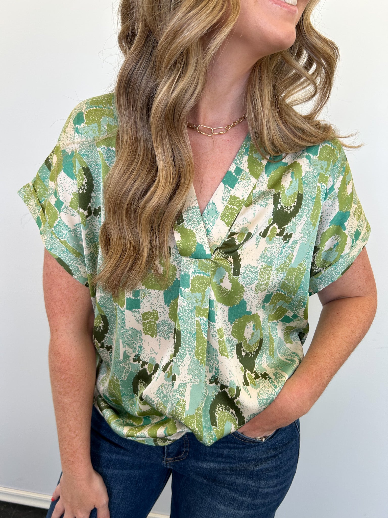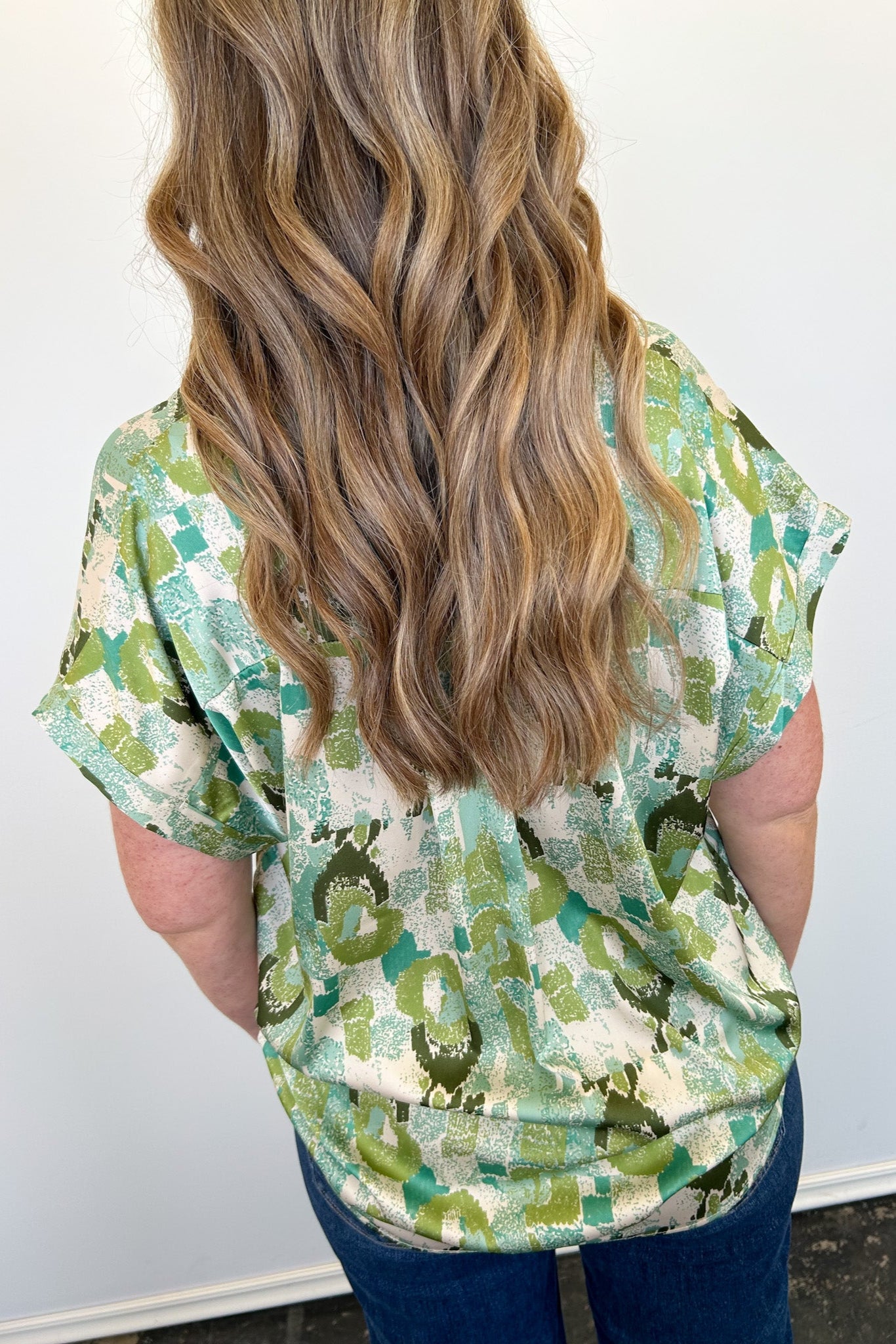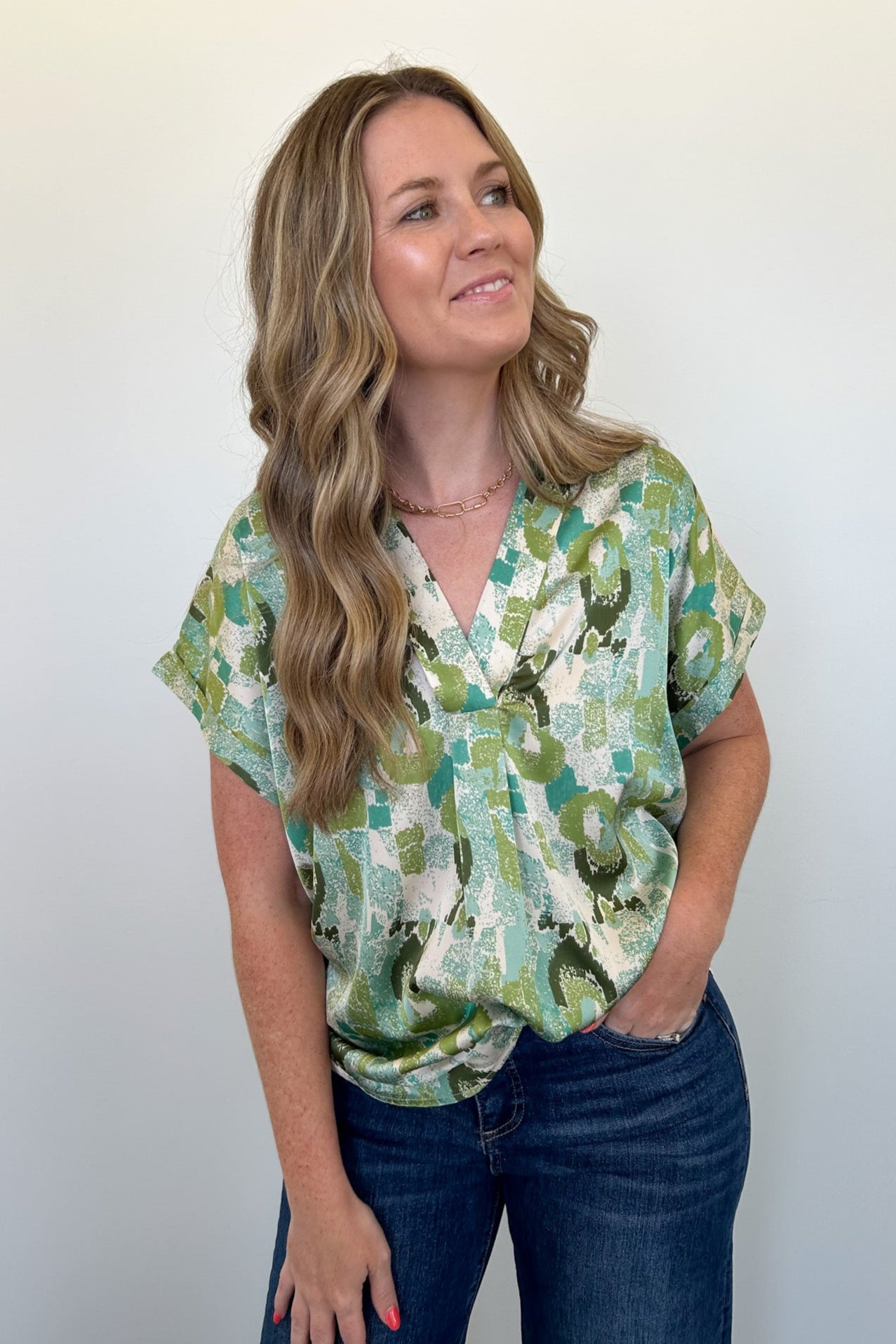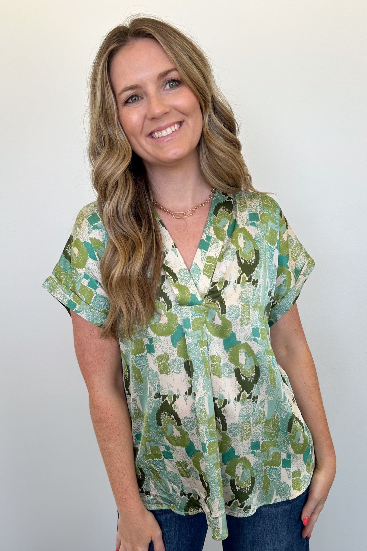 Upgrade your wardrobe with our Fresh Eyes V-neck top. Easy to style, this blouse will be perfect for the office or your weekend plans. Boasting a unique abstract pattern in a rich green color scheme, it will work great with so many different types of pants! The V-neck adds an elegant touch while the lightweight fabric provides comfort. Pair with denim and a necklace for a simple outfit or wear with a blazer and slacks for a day at the office. Treat yourself to this top today!