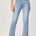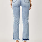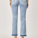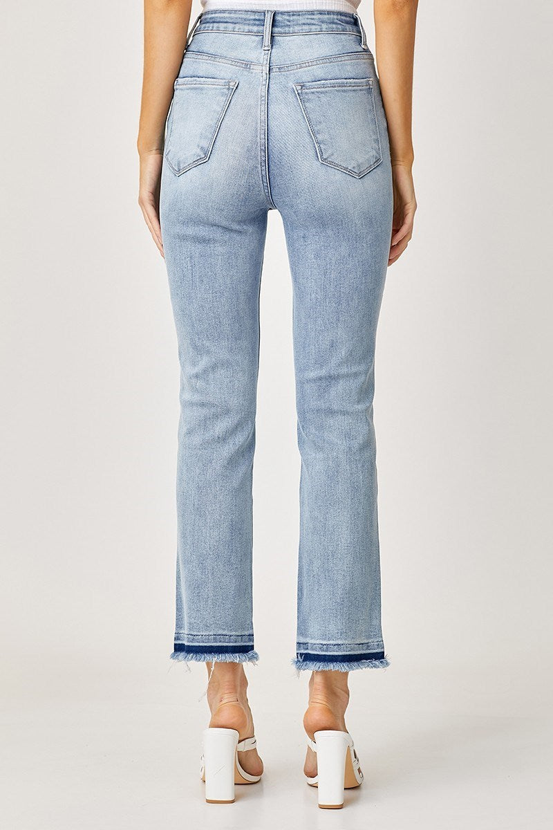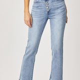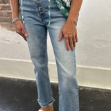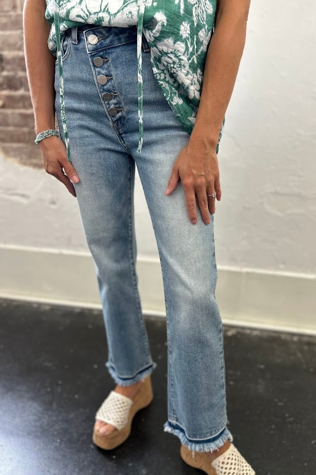 These jeans are a fun take on a flattering fit! The High Rise and cross over style makes them perfect for pairing will cropped sweaters for fall and the raw hem crop give them a relaxed feel great for wearing with fitted booties, mules, flats, and wedges.