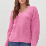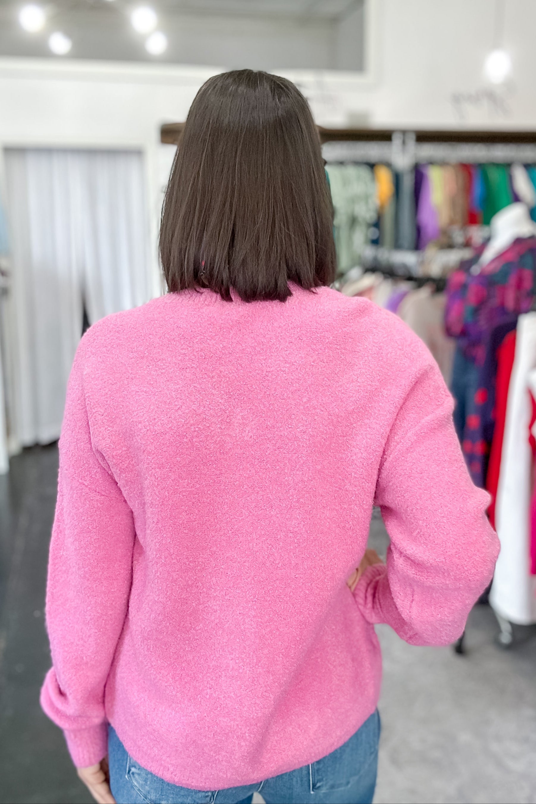 The Love the Moment Sweater in rose pink offers both style and comfort. Its thick and cozy material is perfect for staying warm, while its girly vibes add a touch of femininity to any outfit. Embrace the colder months while staying fashionable with this must-have sweater. This screams girls night! Pair it with denim and a fun necklace for a completed look.