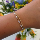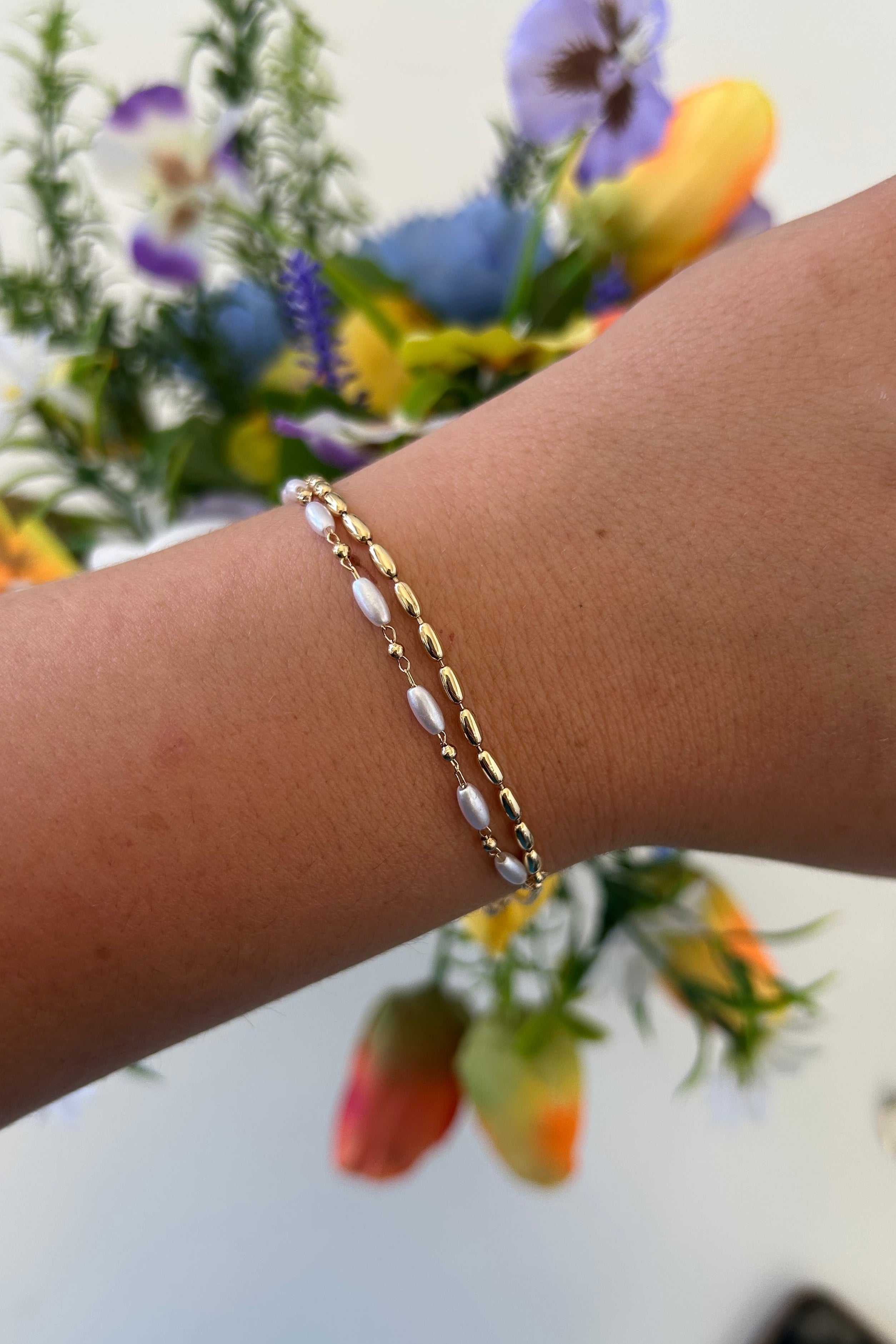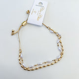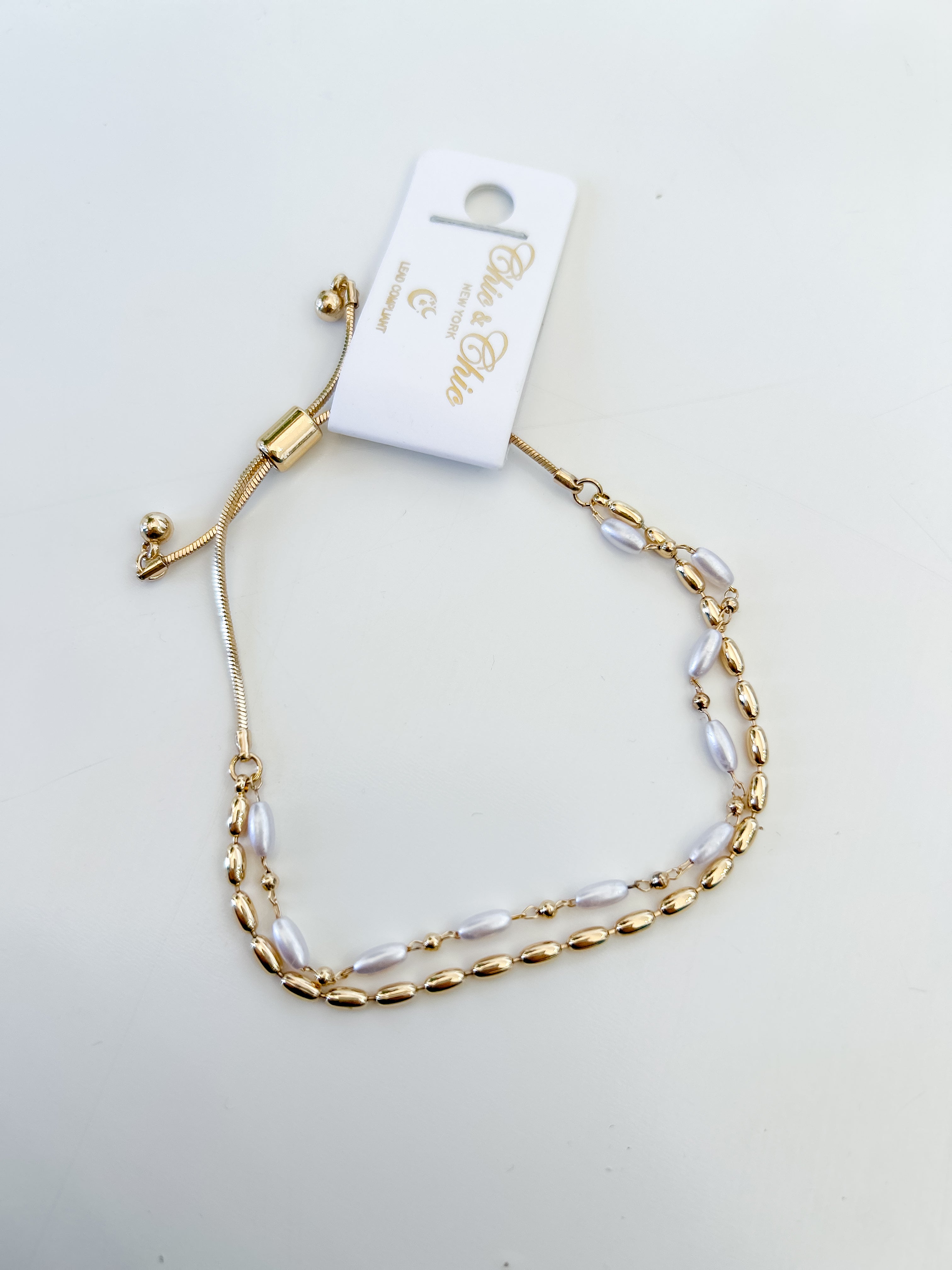 A double-stranded bracelet featuring metal beads and a convenient adjustable length. Available in silver or gold.
