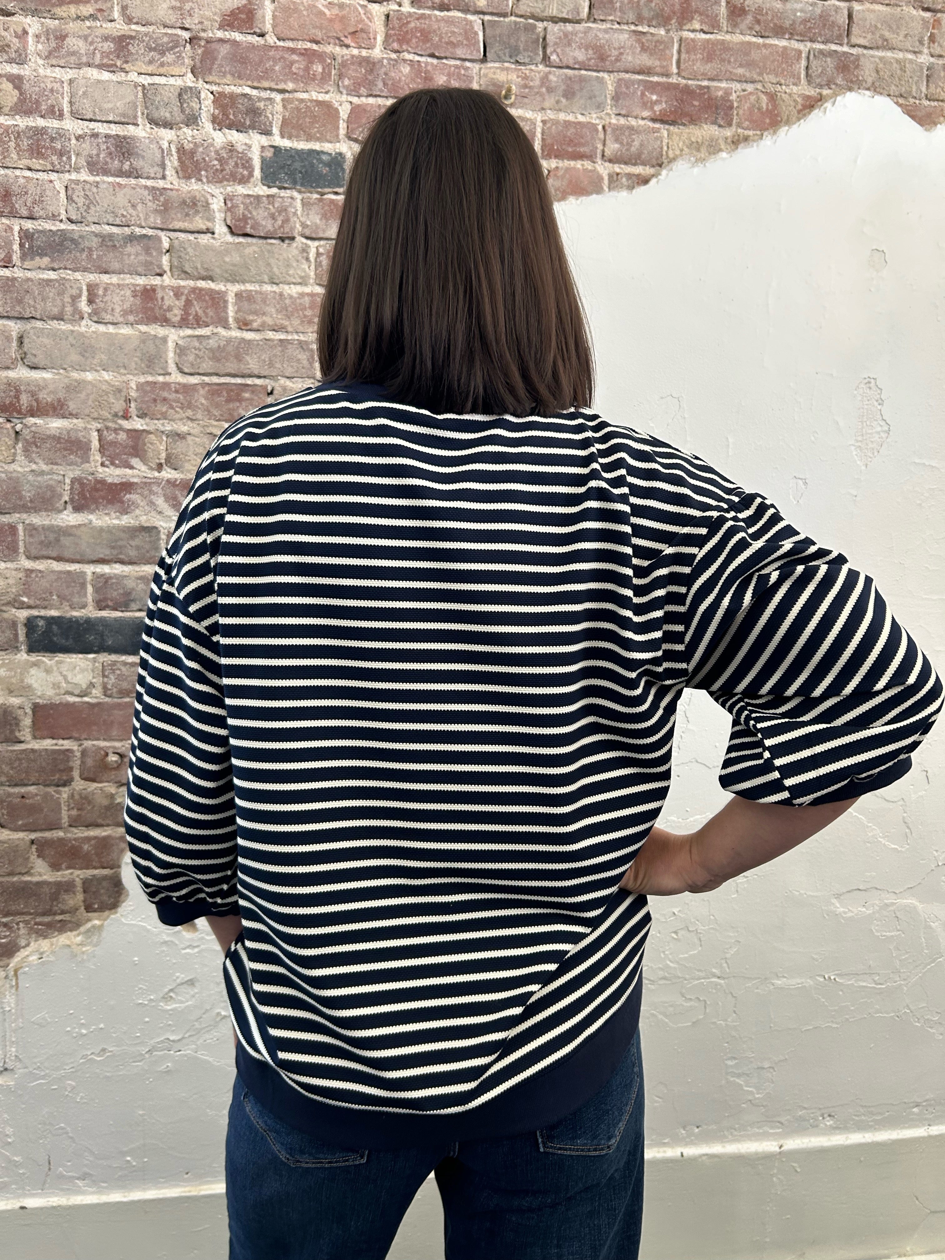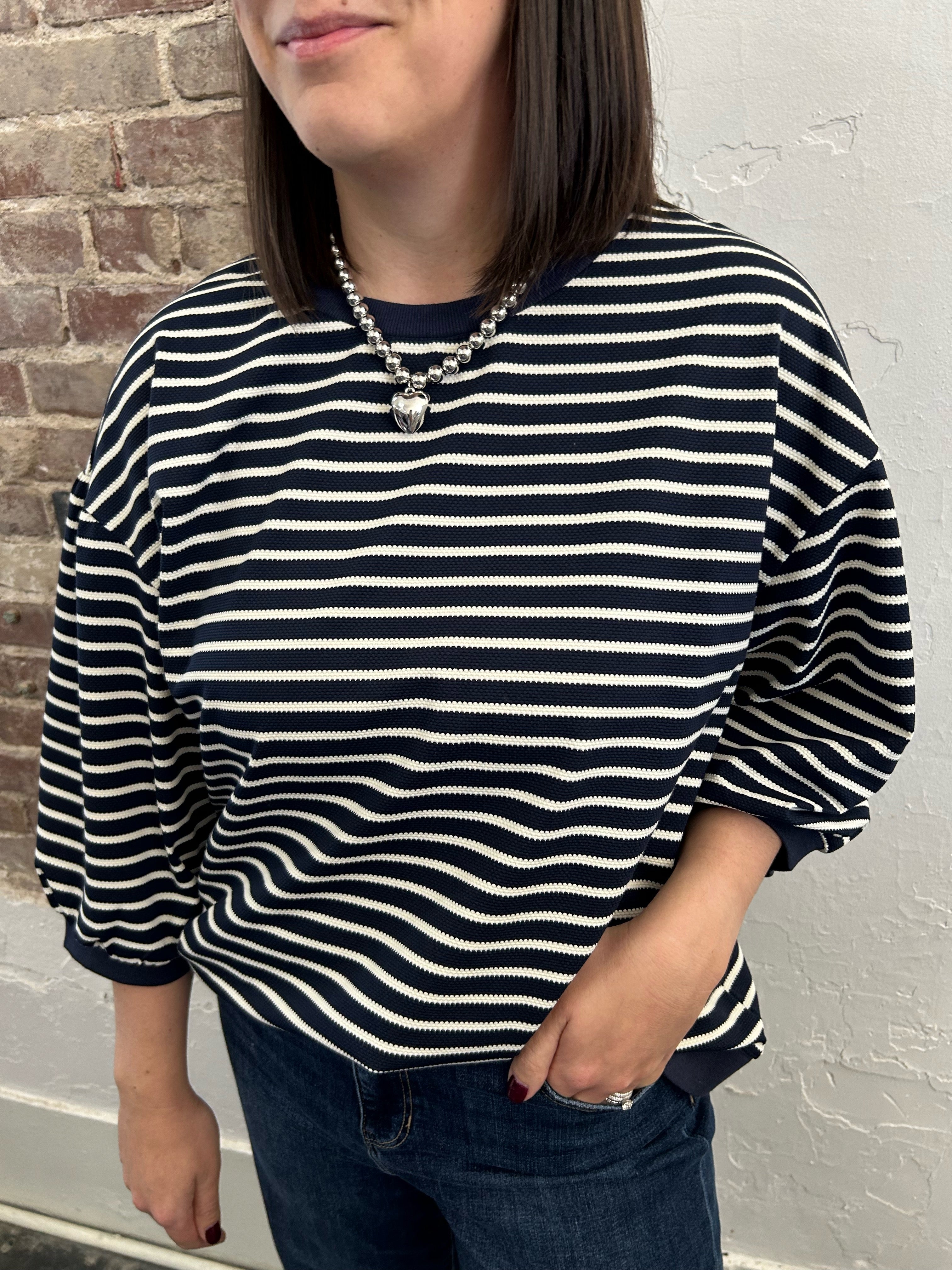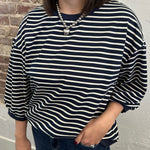 We love an elevated top that feels cozy but looks cute! This easy to style striped top is 3/4 length sleeves and a banded hem. The drop sleeve is a fun detail in additional to the classic stripes and textured material.