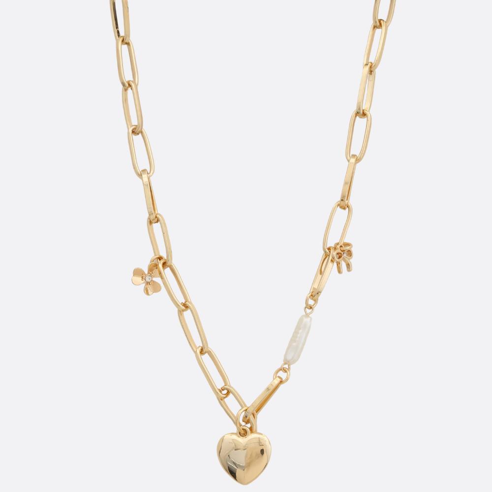 We love a charm piece! This pretty, oval link necklace features heart, bow, and flower charms. Available in silver or gold.