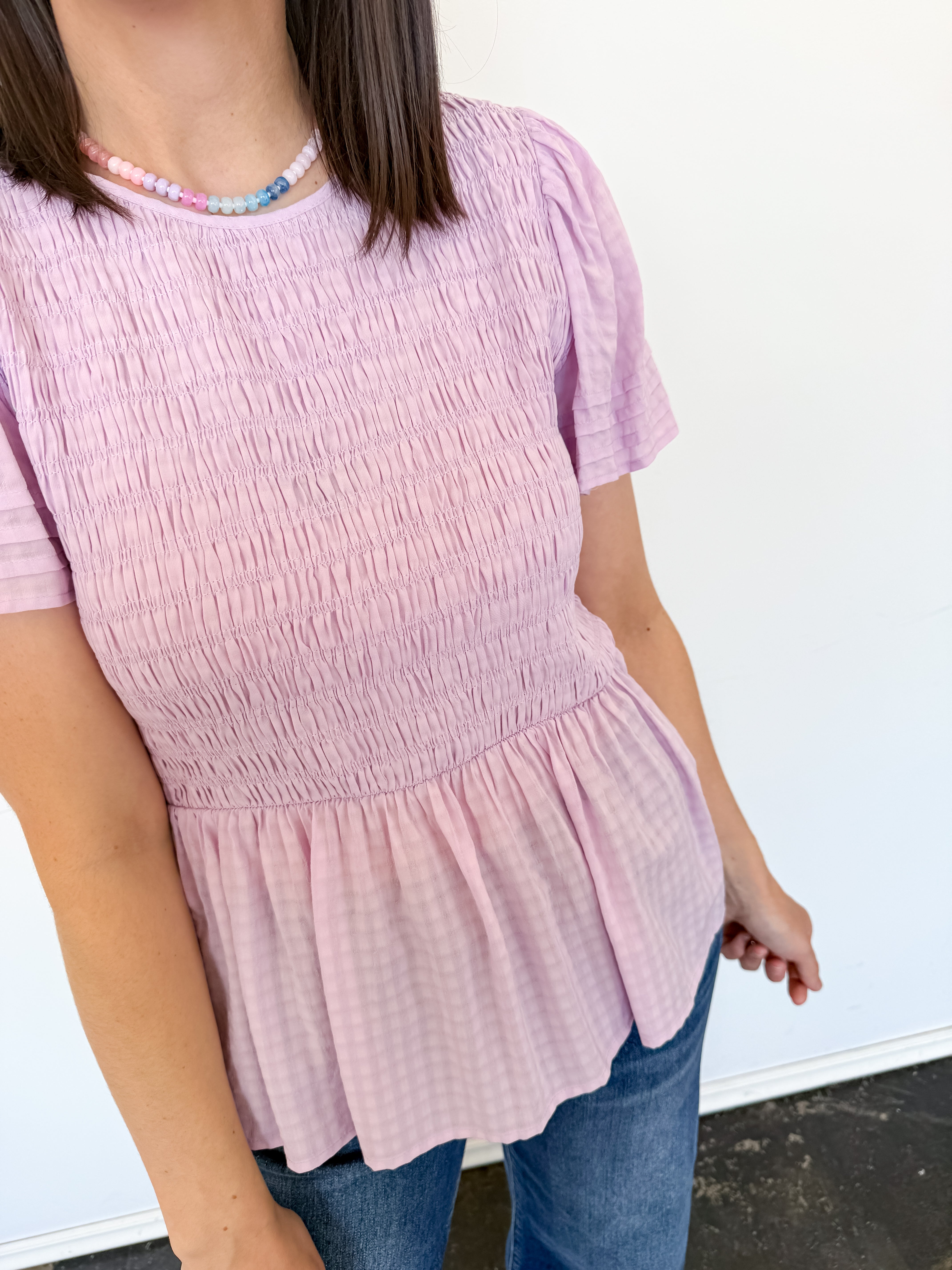 Meet your new wardrobe MVP: the Straight Path Smocked Peplum Top! With its smocked bodice, round neckline, and short sleeves, this purple delight is here to elevate your ensemble game. Perfect for a date or a work meeting—because who says you can't dazzle at the office? (Just don’t spill your coffee on it!)