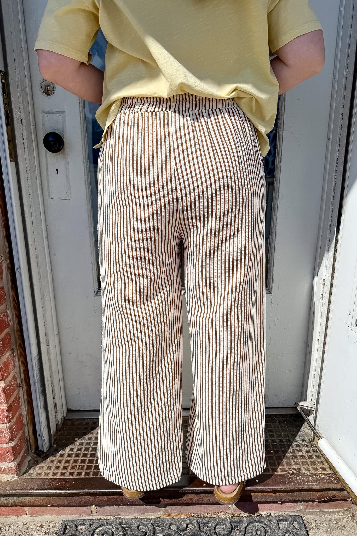 The Gemma Elastic Waist Pants combine comfort and style for your on-the-go lifestyle. These high-waisted, full-length pants feature a classic tan base with crisp white stripes and a stretchy elastic waistband for all-day ease. The tie detail at the waist adds a polished touch that transitions seamlessly from casual to put-together. Pair them with a button-down blouse for vacation getaways or throw on a basic tank for quick errands. Perfect for anyone who refuses to compromise between comfort and style.